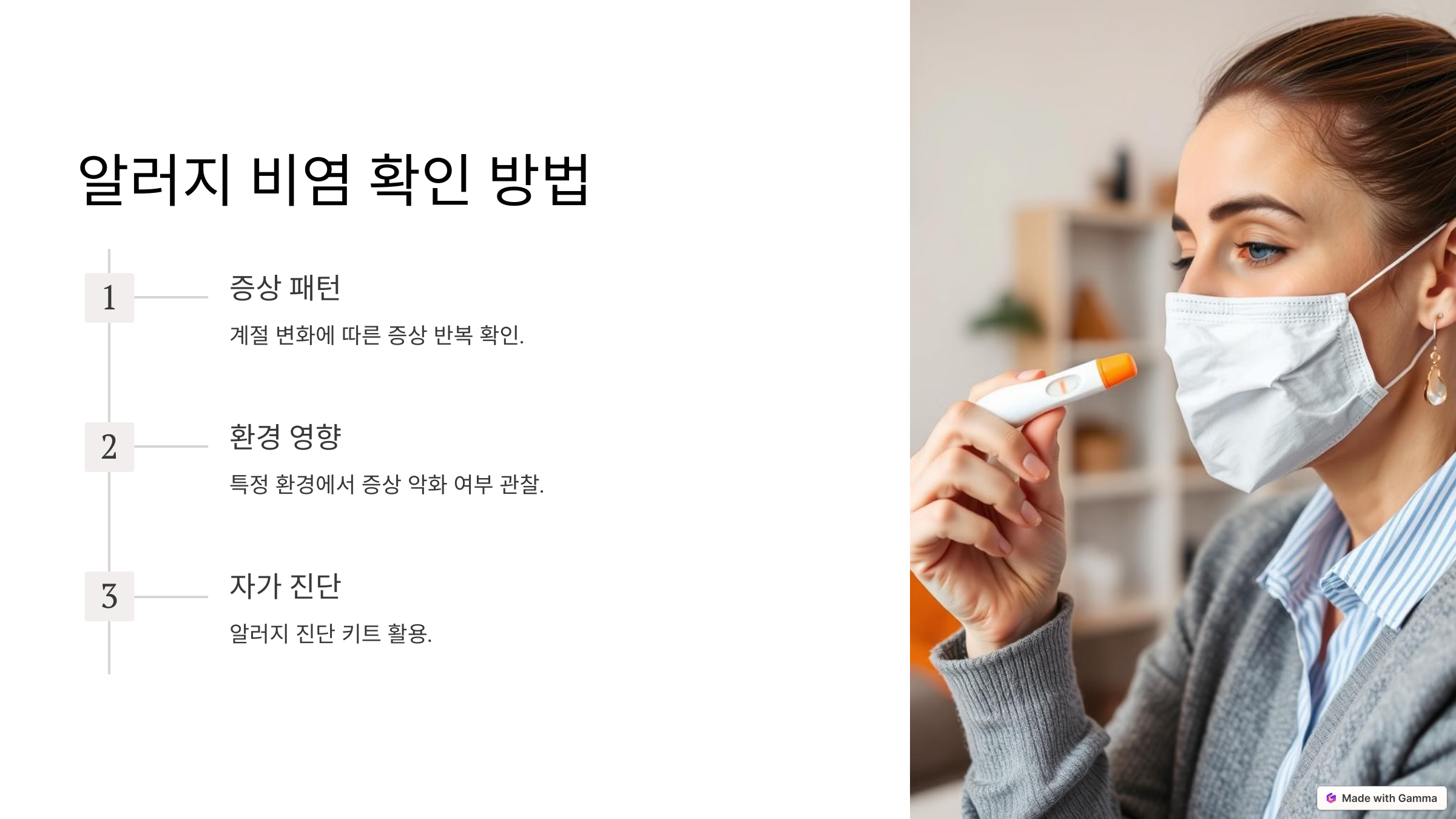 알러지 비염은 주로 계절 변화에 따라 증상이 나타나는 경우가 많습니다. 봄이나 가을철에 증상이 반복된다면, 계절성 알러지일 가능성이 큽니다. 반면, 집먼지나 애완동물 털에 민감한 경우에는 연중 내내 증상이 나타날 수 있습니다.