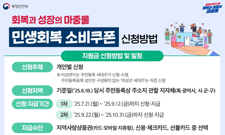 소비쿠폰은 별도의 신청 절차 없이 지정된 카드사(국민, 농협, 신한 등)와 연계된 가맹점에서 결제 시 자동으로 적용됩니다. 쿠폰이 적용되기 위해서는 사전 이벤트 응모가 필수일 수 있으니, 해당 카드사 홈페이지나 앱에서 이벤트 참여 여부를 꼭 확인하세요.