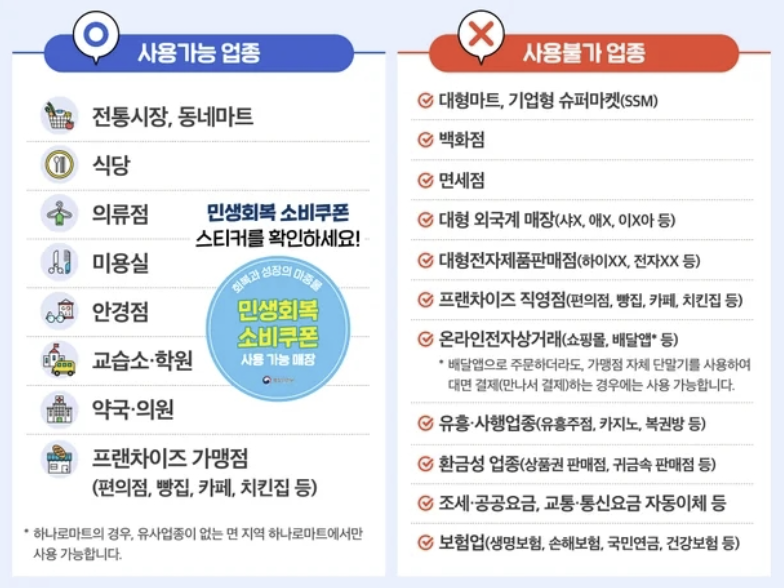 단, 소비쿠폰은 사용 가능한 업종과 불가능한 업종이 명확히 구분되어 있어 사전에 확인이 필요합니다. 특히, 대형 프랜차이즈 직영 매장이나 온라인 결제는 대부분 제외되므로, ‘가맹점’ 여부와 결제 방식이 핵심 조건입니다.