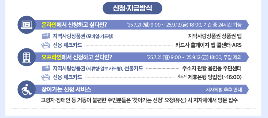 신청은 출생연도 끝자리 기준 요일제가 적용돼요. 오프라인 신청은 신용카드나 체크카드로 연계된 은행 창구에서 본인 명의로 신청 및 수령할 수 있어요. 선불카드는 동주민센터에서 신청 가능하며, 본인뿐 아니라 대리인 신청도 가능해요.