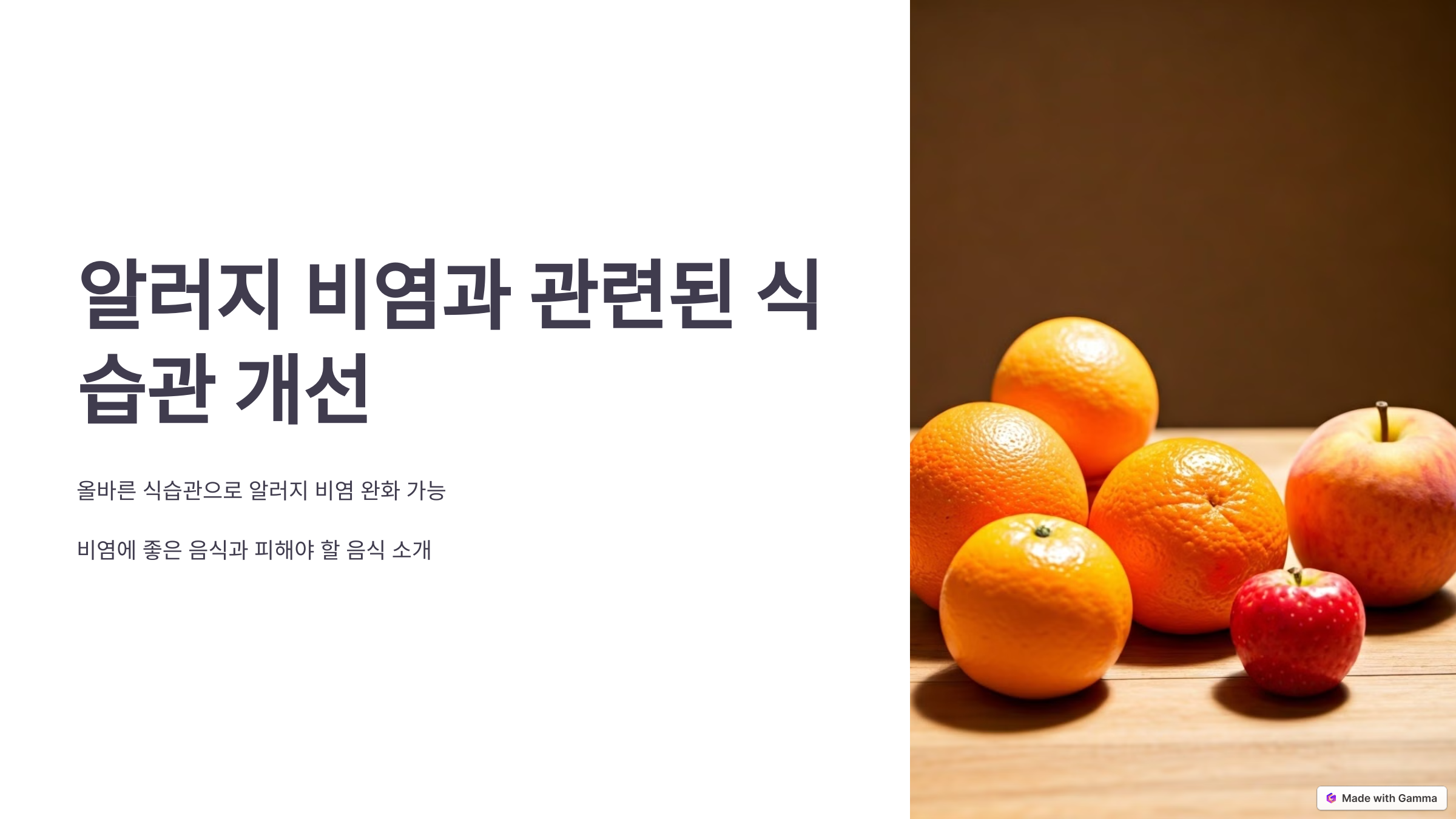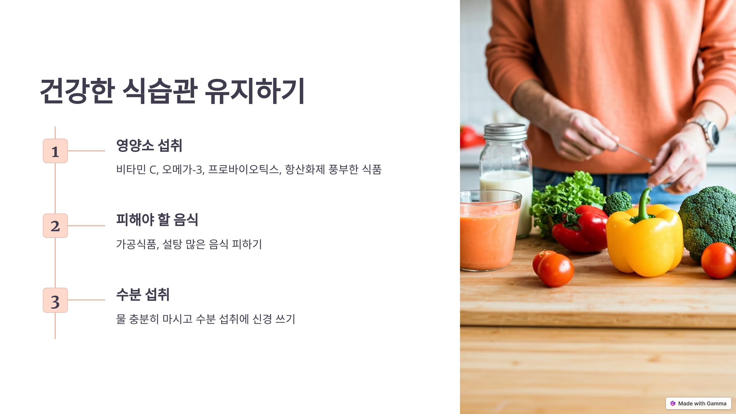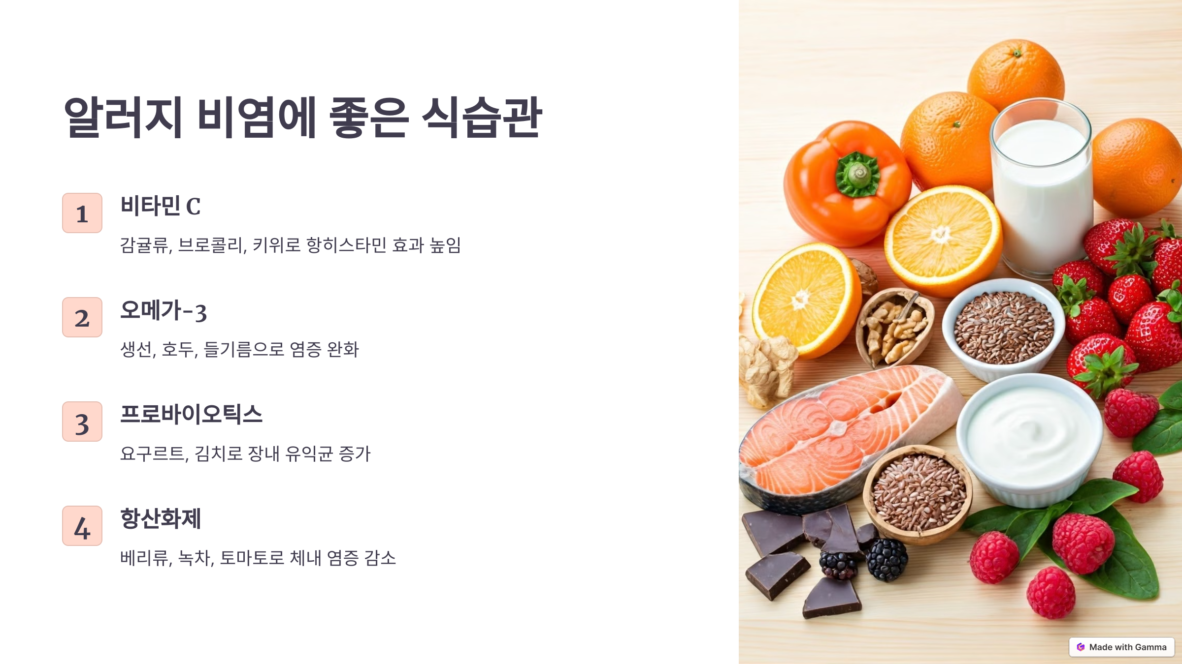 알러지 비염 증상을 완화하기 위해서는 건강한 식습관이 중요합니다. 비타민 C, 오메가-3 지방산, 프로바이오틱스, 항산화제가 풍부한 식품을 섭취하고, 가공식품과 설탕이 많은 음식을 피하세요. 물을 충분히 마시고 수분 섭취에 신경 쓰면서 건강한 생활을 유지해 비염 증상을 효과적으로 완화할 수 있습니다. 지금부터 올바른 식습관을 실천하여 비염 걱정 없는 일상을 만들어 보세요!