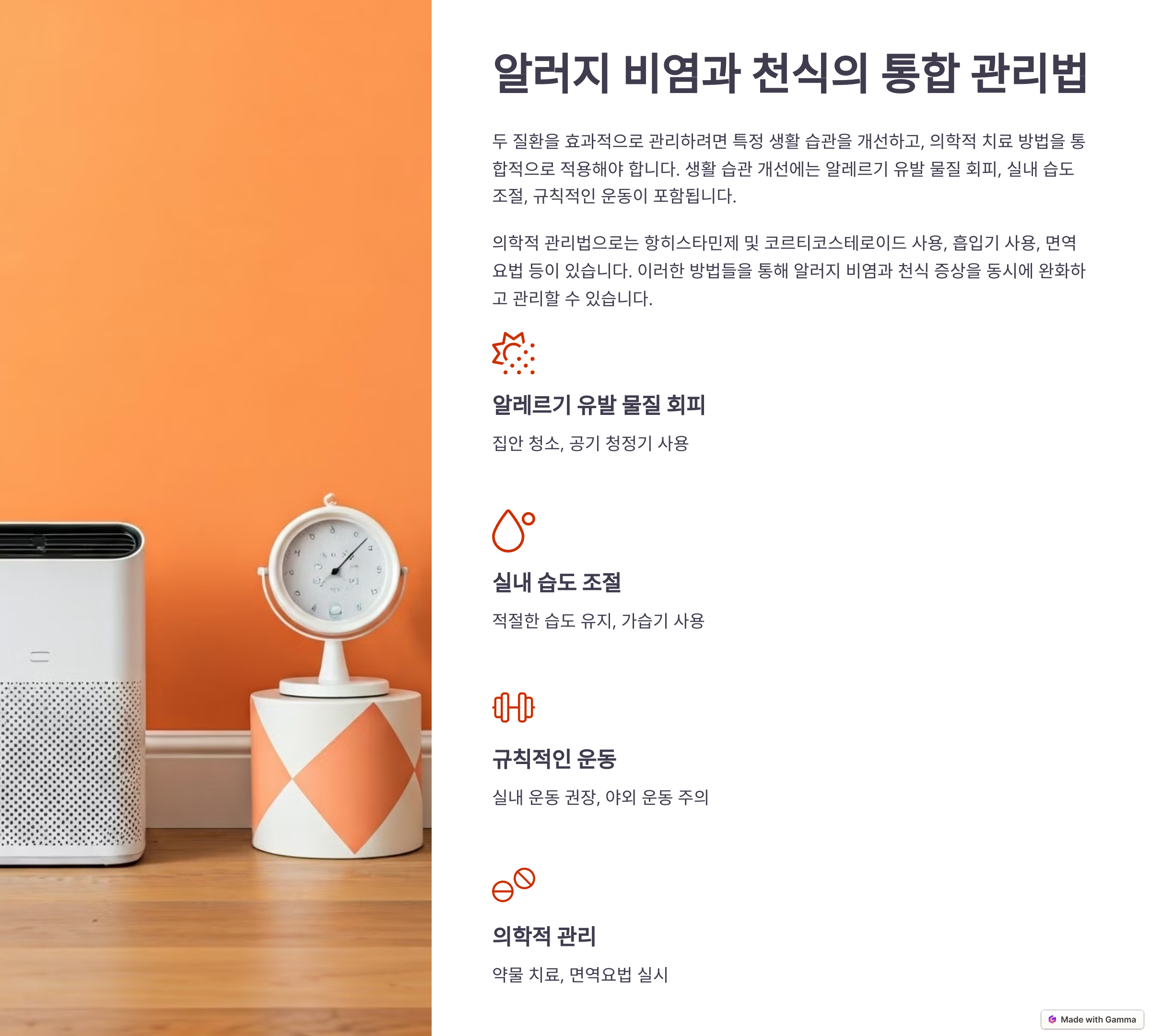 - 알레르기 유발 물질 회피 : 집안의 먼지나 애완동물의 털, 꽃가루와 같은 물질을 최대한 차단하고, 집을 자주 청소하여 실내 공기를 청결히 유지하는 것이 좋습니다.
