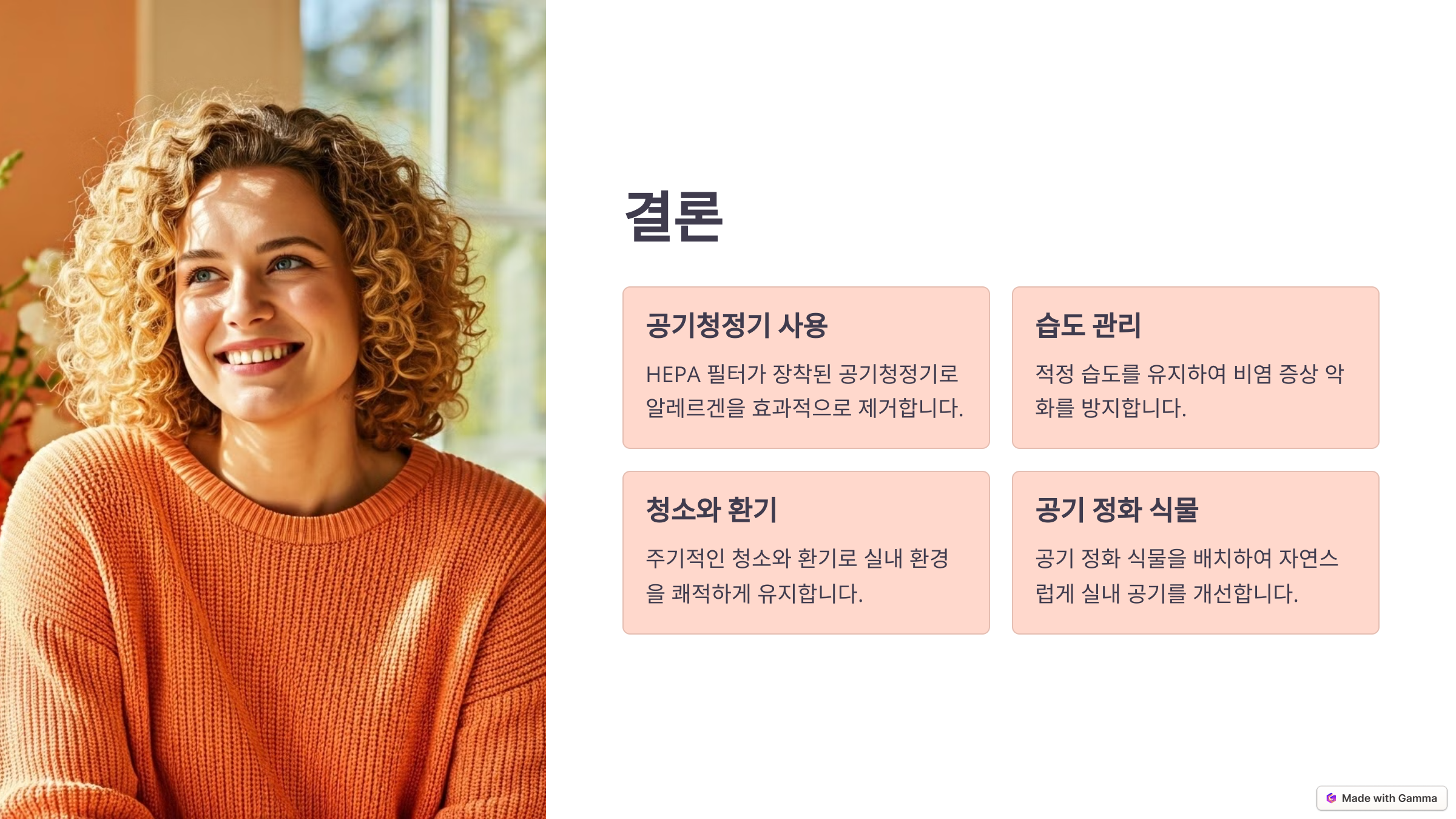 - 추천사항 : HEPA 필터가 포함된 공기청정기를 사용하면 미세먼지와 알레르겐을 걸러주는 데 효과적입니다.