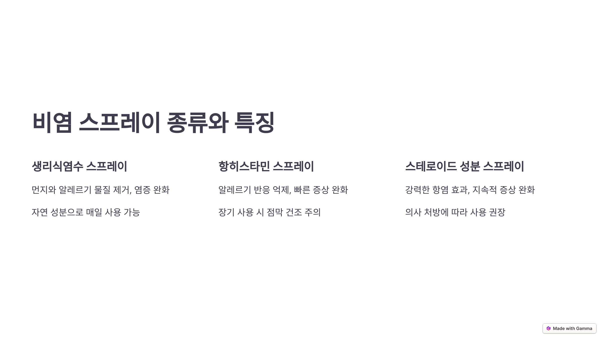 - 항히스타민 성분이 포함된 스프레이는 알레르기 반응을 직접적으로 억제해 비염 증상을 빠르게 완화합니다.