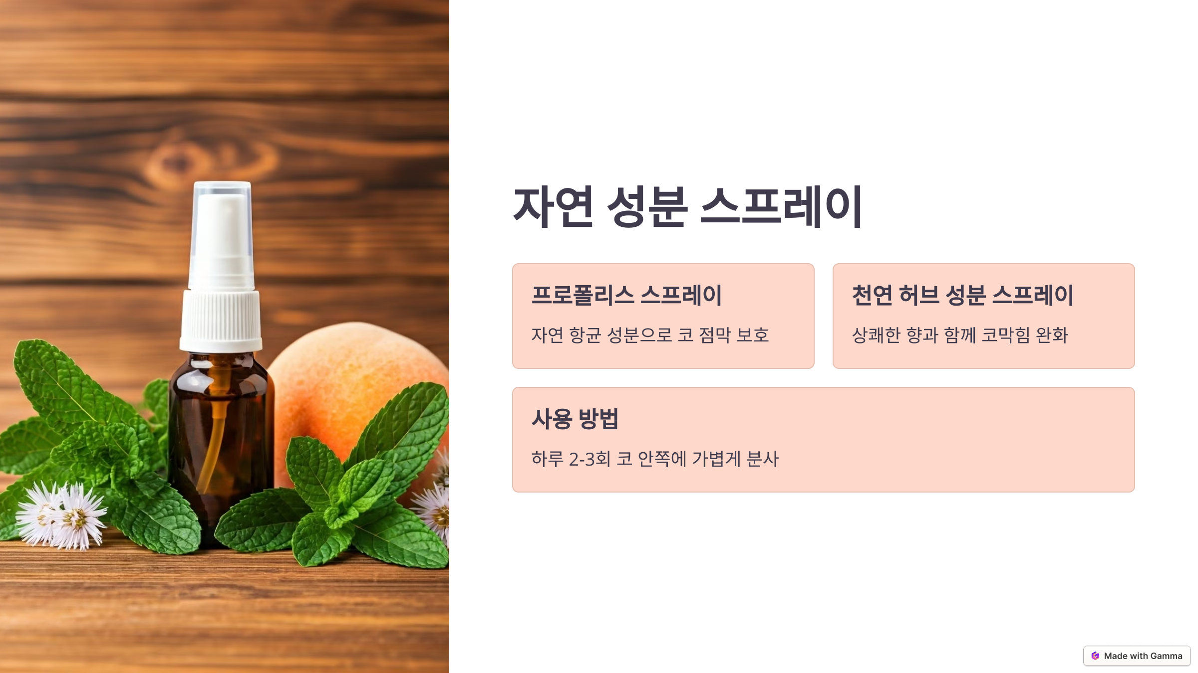 - 프로폴리스는 **자연 항균 성분**이 풍부하여 코 점막을 보호하고 염증 완화에 도움을 줍니다.