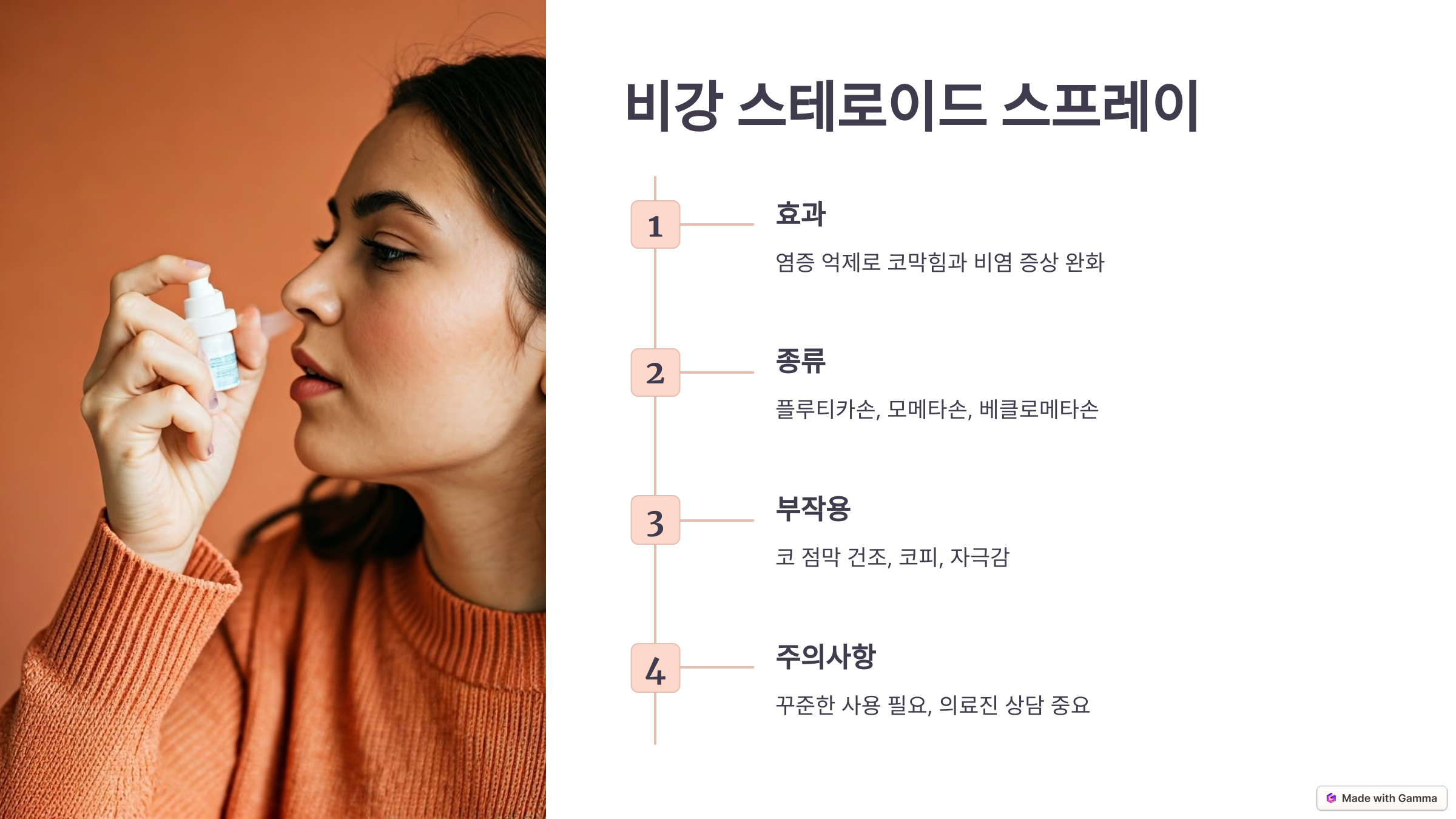 - 플루티카손, 모메타손, 베클로메타손 등이 있으며, 하루 1-2회 사용으로 효과를 볼 수 있습니다.