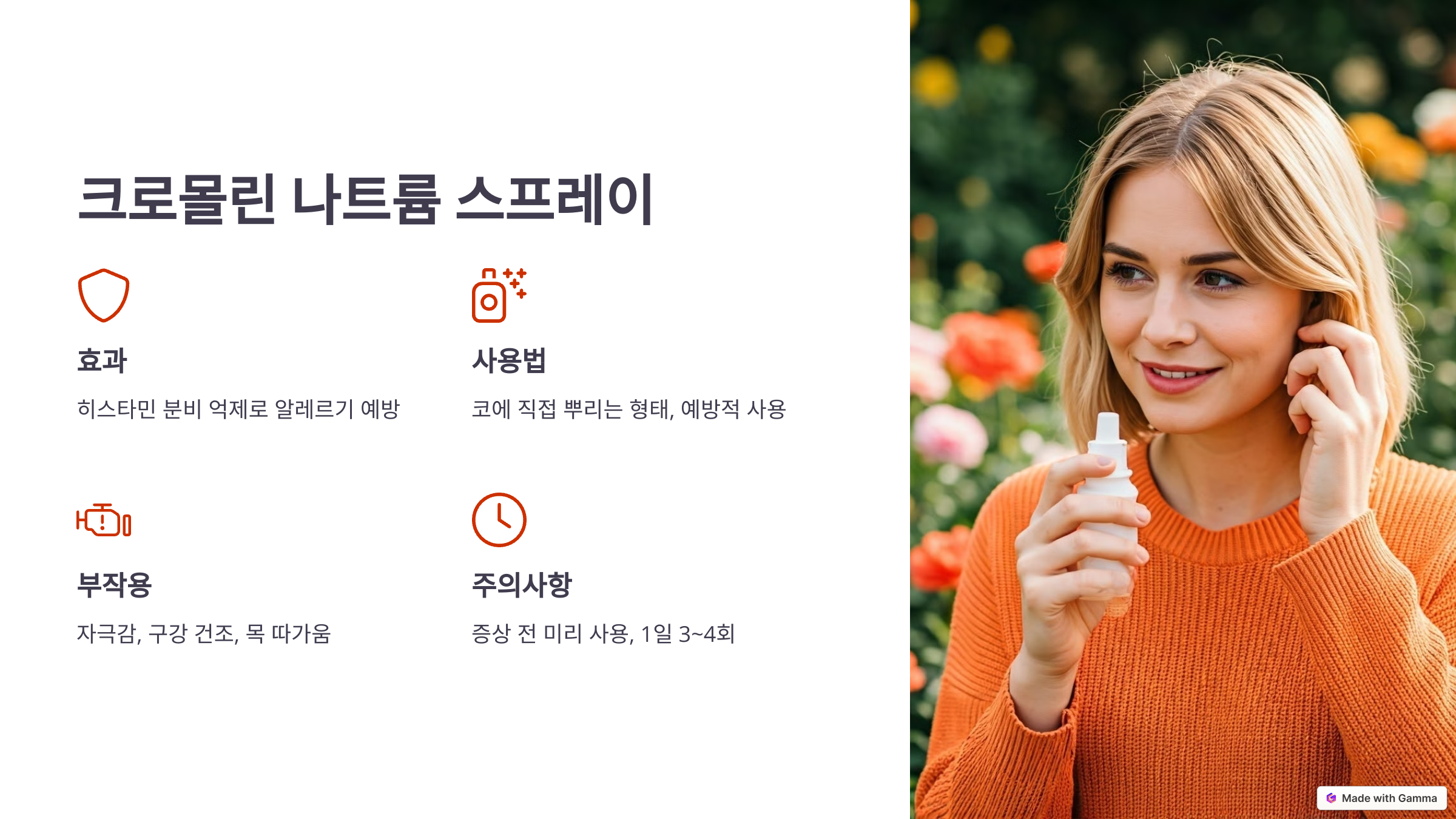 - 크로몰린 나트륨 스프레이는 히스타민 분비를 억제하여 알레르기 증상을 예방하는 데 도움을 줍니다.