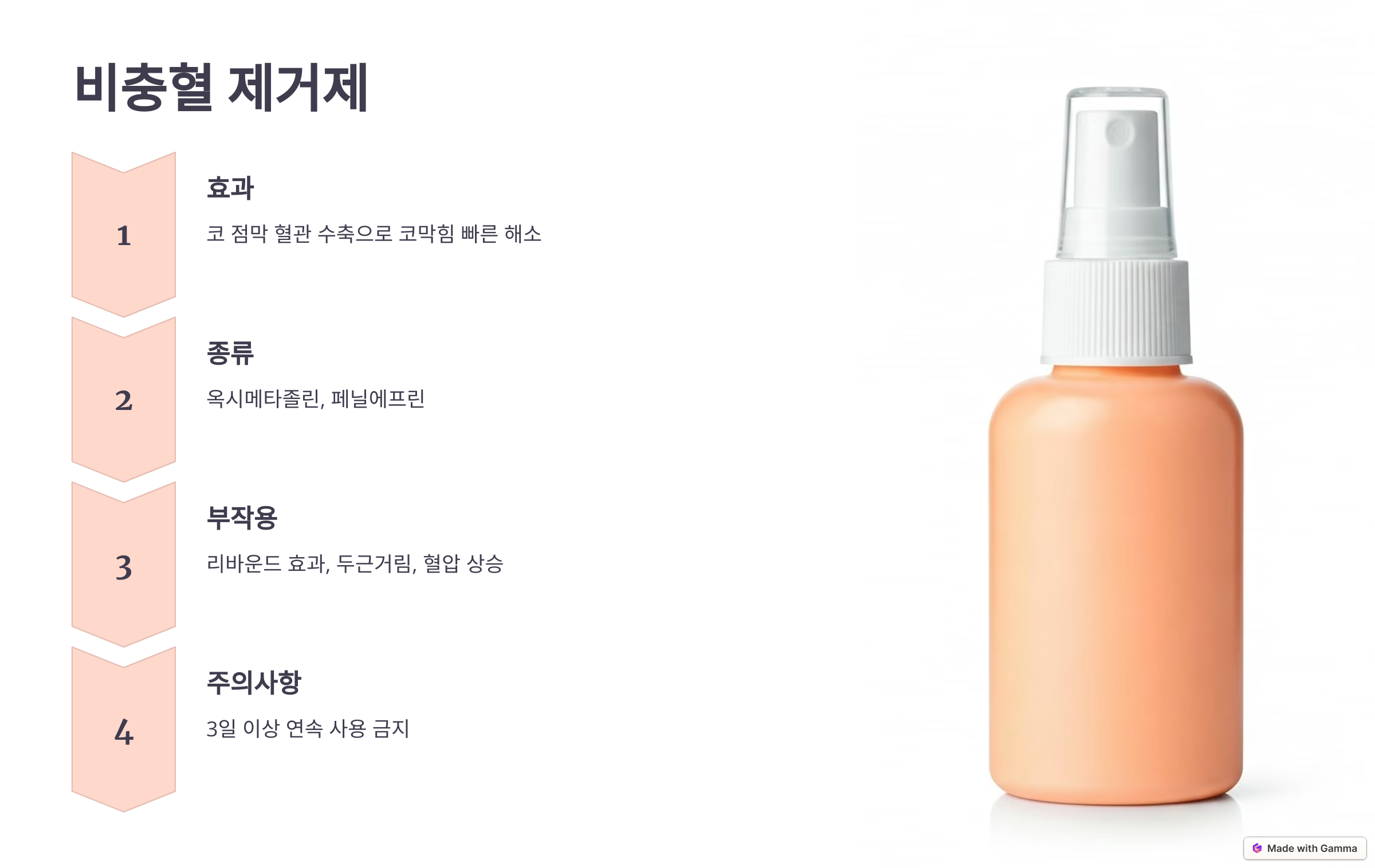 - 주로 계속적인 코막힘, 심한 알레르기 증상에 사용되며, 장기적으로 사용할 때 효과가 높아집니다.