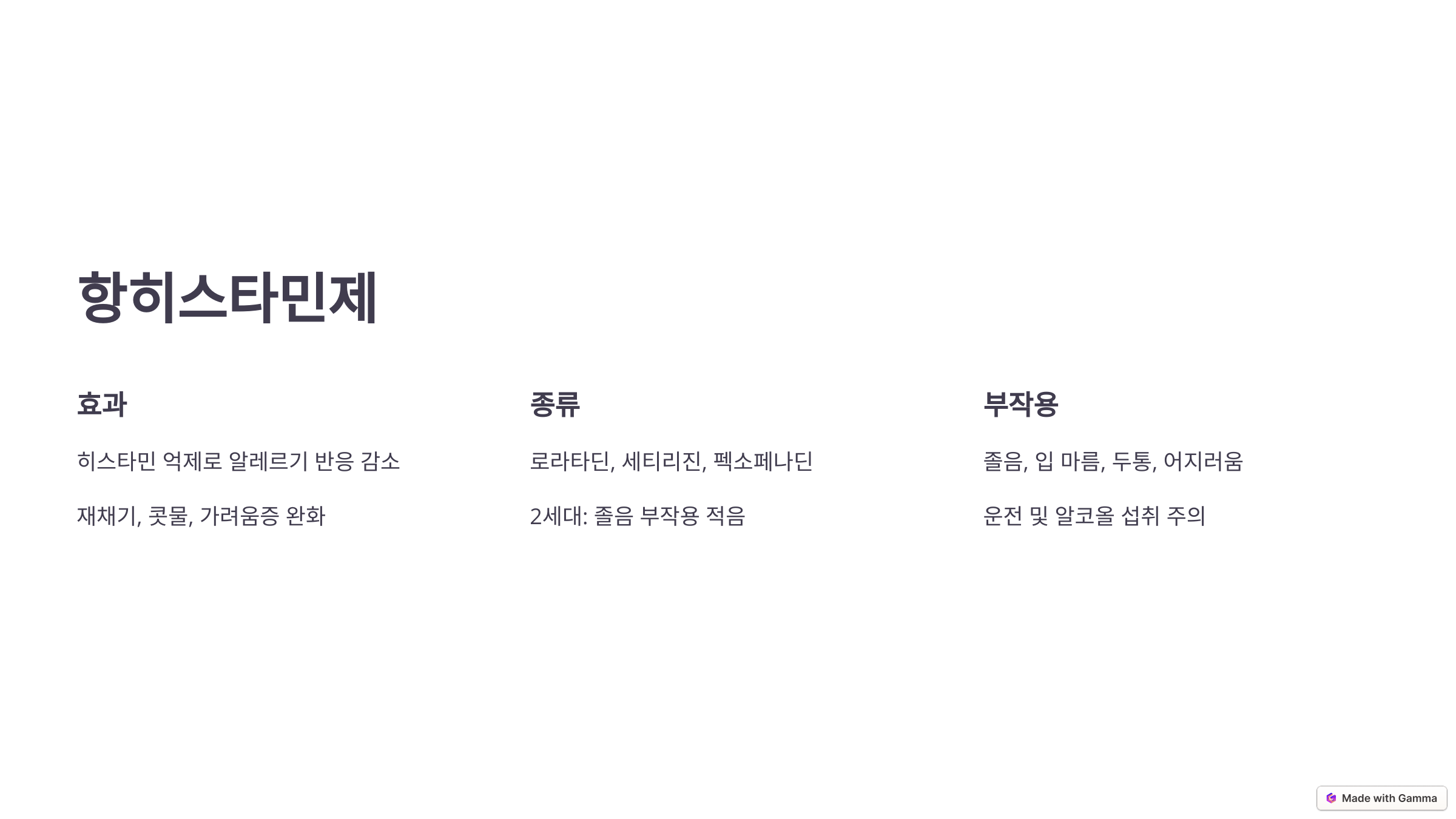 - 항히스타민제는 히스타민을 억제하여 알레르기 반응을 줄여줍니다.