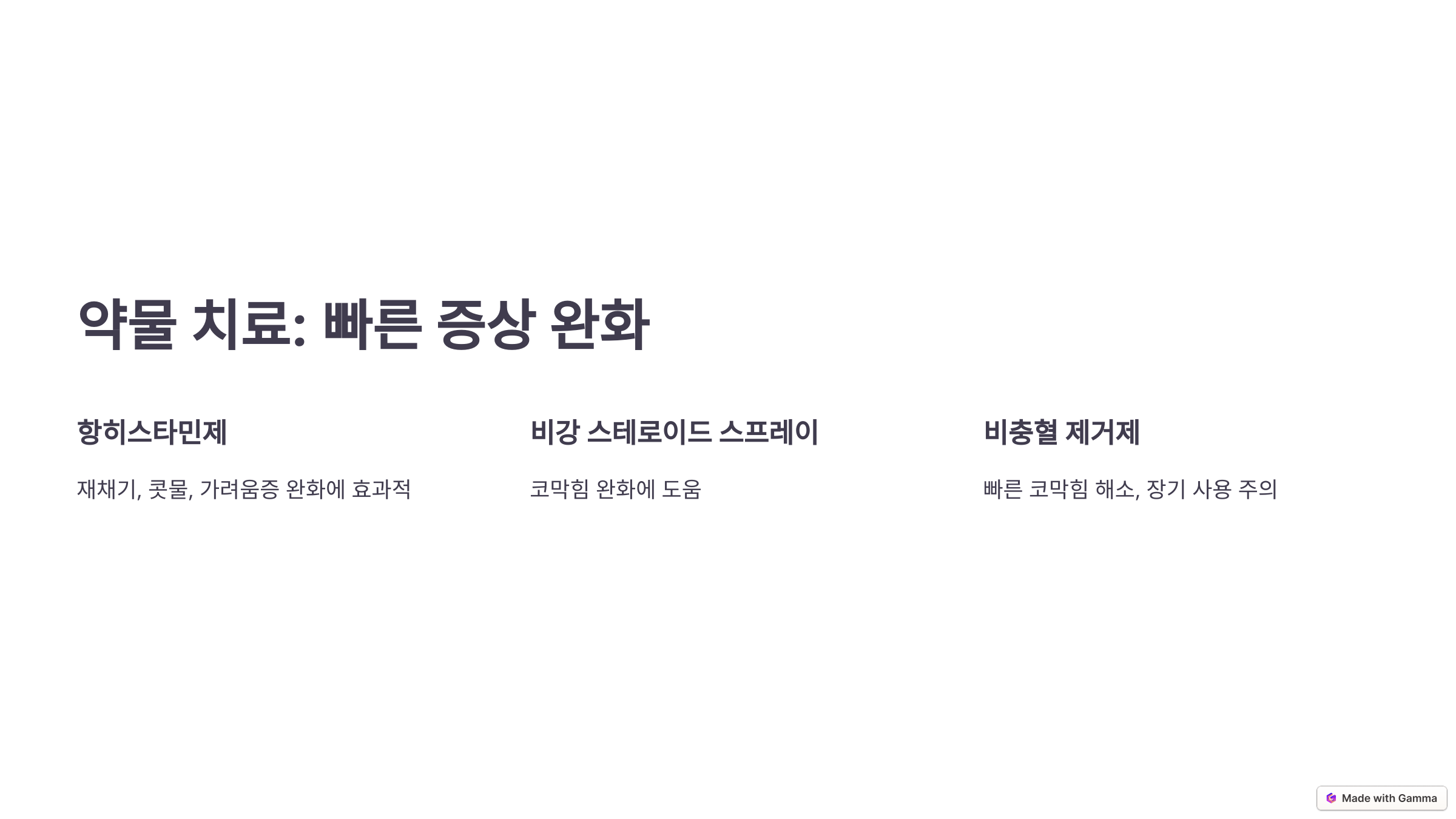 약물 치료는 비염 증상을 신속하게 완화하는 데 효과적입니다. 즉각적인 효과를 얻을 수 있으므로 비염이 심할 때 활용할 수 있습니다.