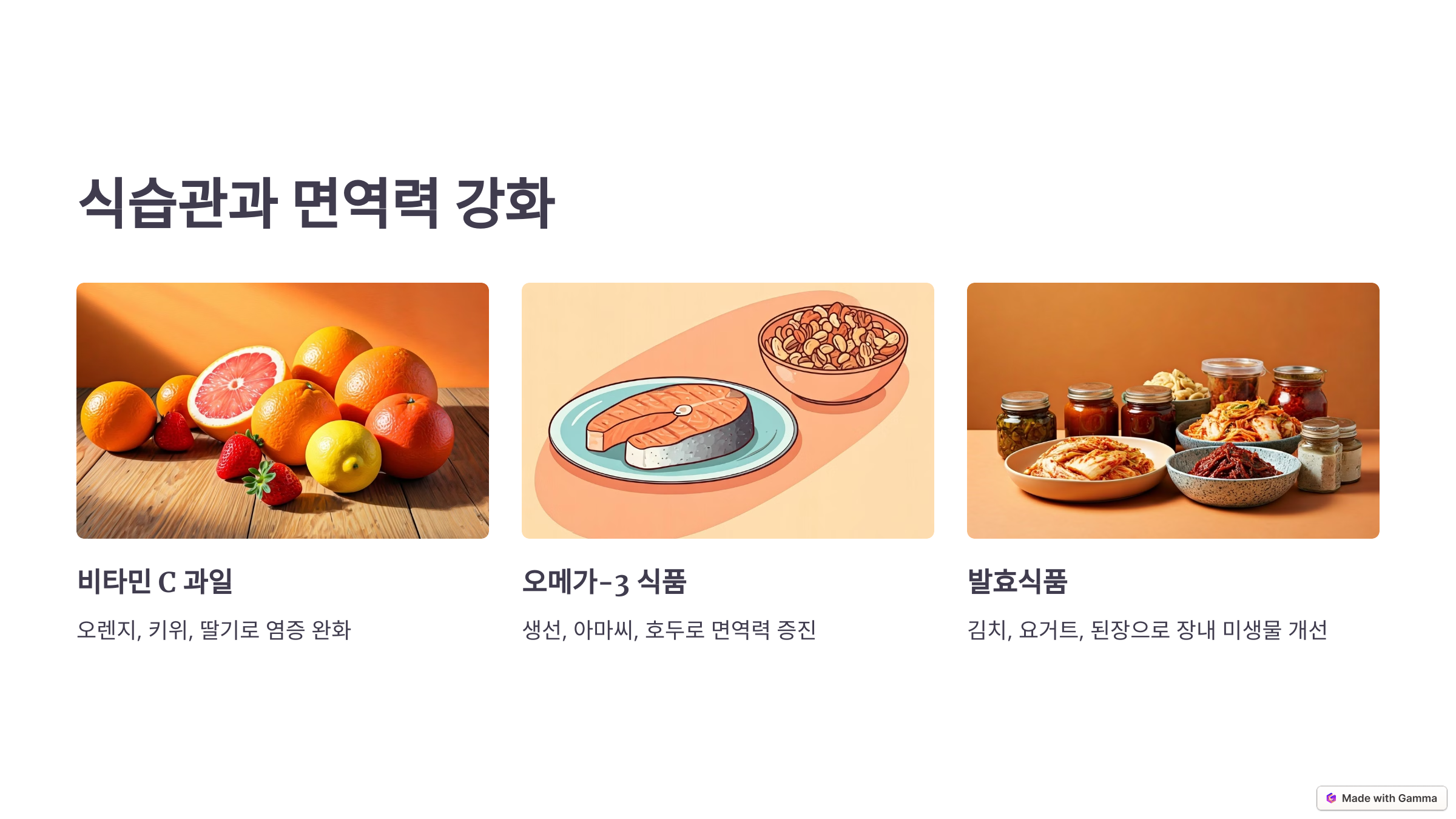 - 오메가-3 지방산: 생선, 아마씨, 호두 등에 함유된 오메가-3는 염증을 줄이고 면역력을 높여줍니다.