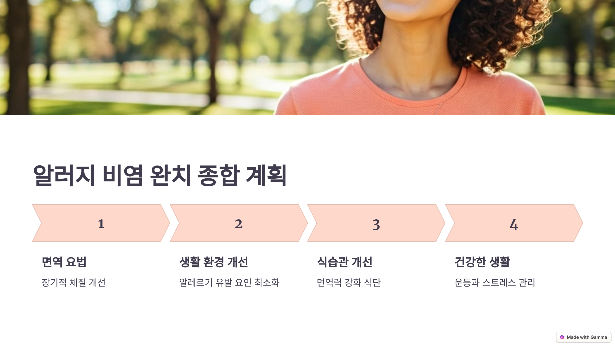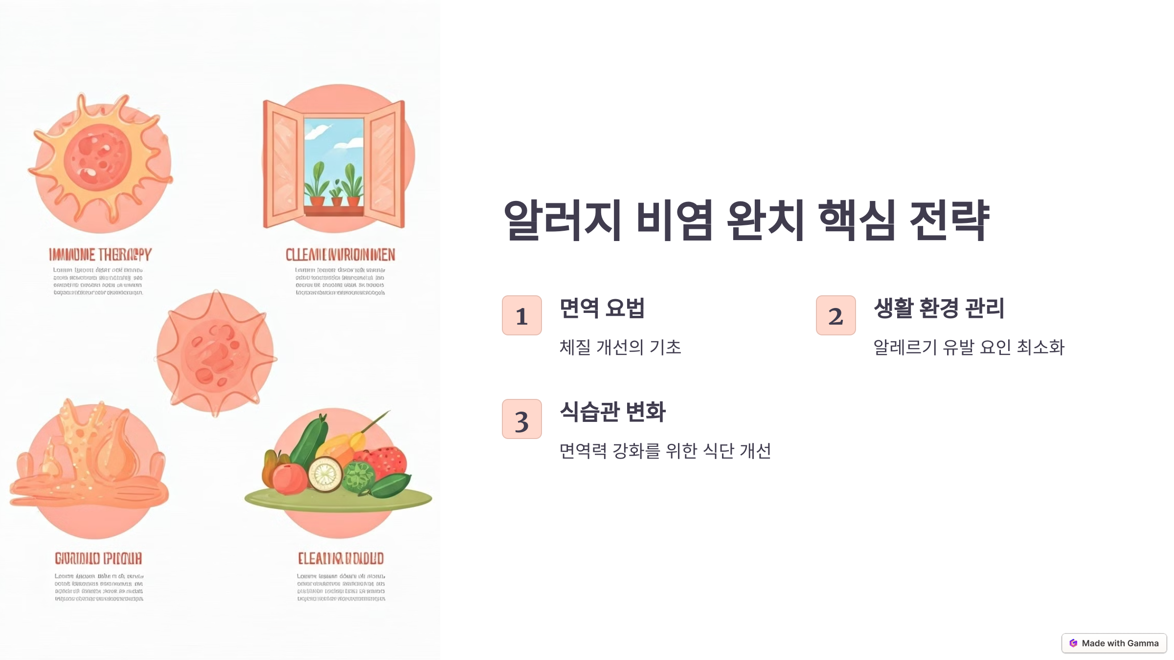 알러지 비염을 완치하려면 단기적인 약물 치료뿐 아니라, 장기적인 생활 습관 변화와 면역 개선이 필요합니다. 알러지 비염에 대한 체질 개선을 목표로 면역 요법, 생활 환경 관리, 식습관 변화를 포함한 장기적인 계획을 세워봅시다.
