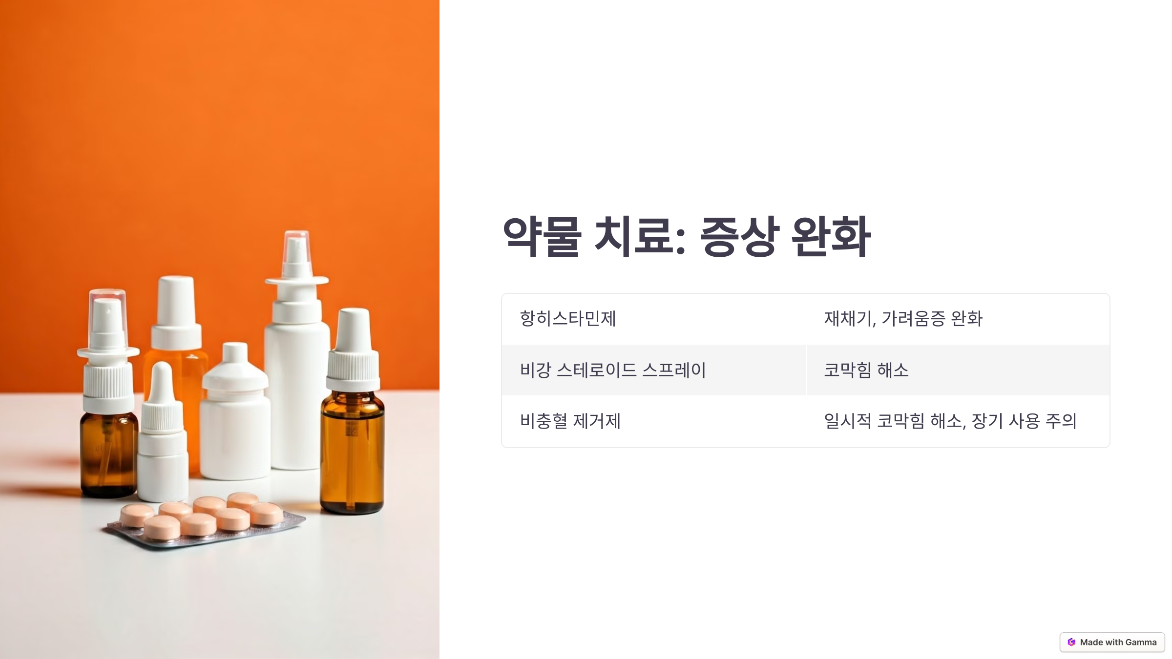 약물 치료는 비염 증상이 심할 때 일시적으로 증상을 완화하는 데 사용될 수 있습니다. 특히, 면역 요법 초기나 알레르기 물질에 대한 노출이 높은 시기에 도움이 됩니다.