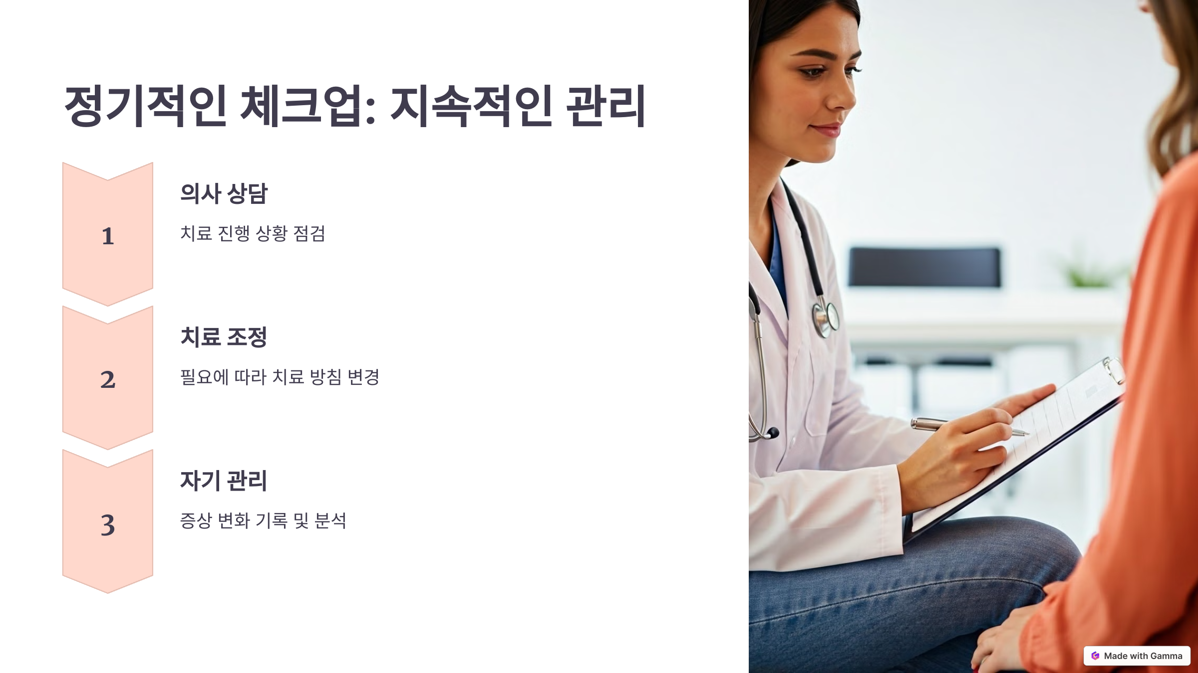 - 의사와의 정기 상담: 치료 진행 상황을 점검하고 필요에 따라 치료 방침을 조정합니다.