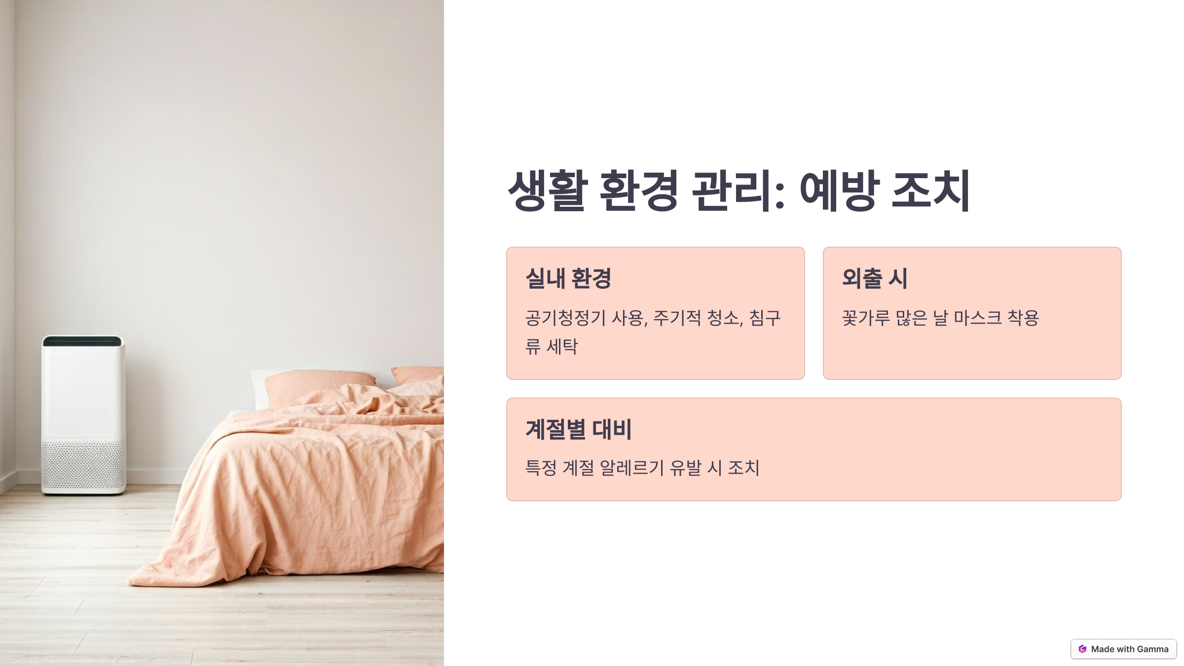 - 계절별 알레르기 주의: 특정 계절에 알레르기가 유발되는 경우, 해당 시즌에 대비한 조치를 취합니다.