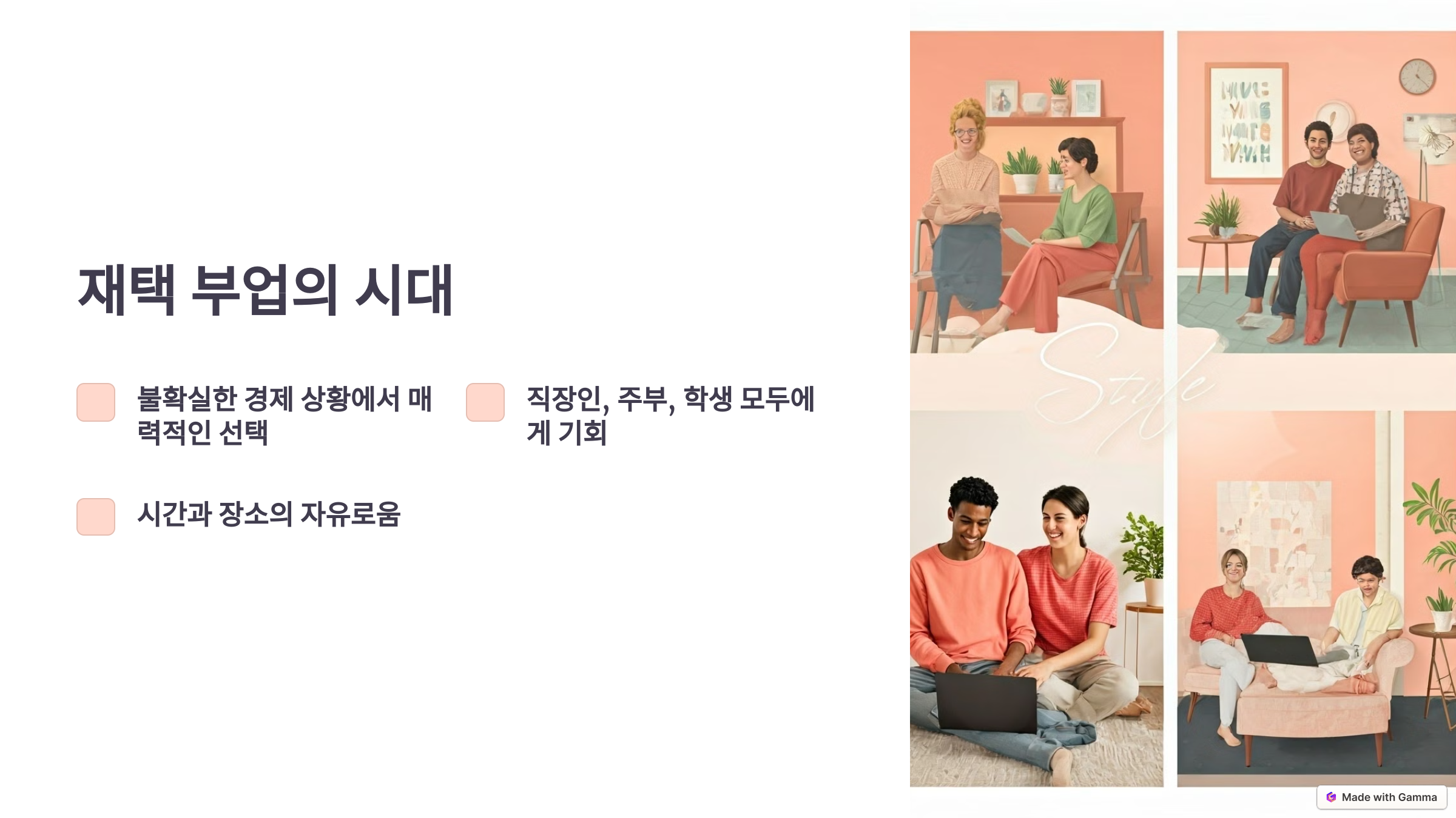 요즘 재택근무와 함께 재택 부업에 대한 관심이 높아지고 있어요. 직장인도, 전업주부도, 학생도 자신만의 시간과 장소에서 수익을 창출할 수 있는 시대가 온 겁니다! 특히, 요즘같이 불확실한 경제 상황에서는 '내 방 한켠에서 나만의 부수입을 만든다'는 개념이 많은 사람들에게 매력적으로 다가오죠.