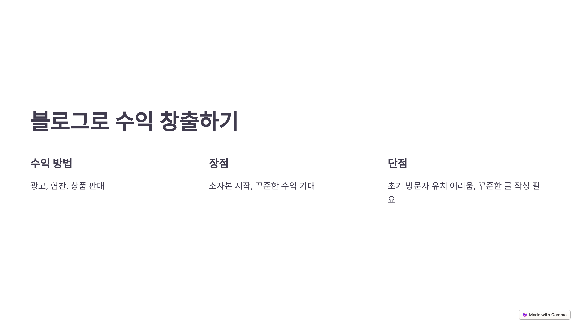 장점: 소자본으로 시작할 수 있으며, 콘텐츠가 쌓이면 꾸준한 수익을 기대할 수 있습니다. 단점: 처음엔 방문자를 끌어모으기까지 시간이 걸릴 수 있고, 꾸준한 글 작성이 필요합니다.