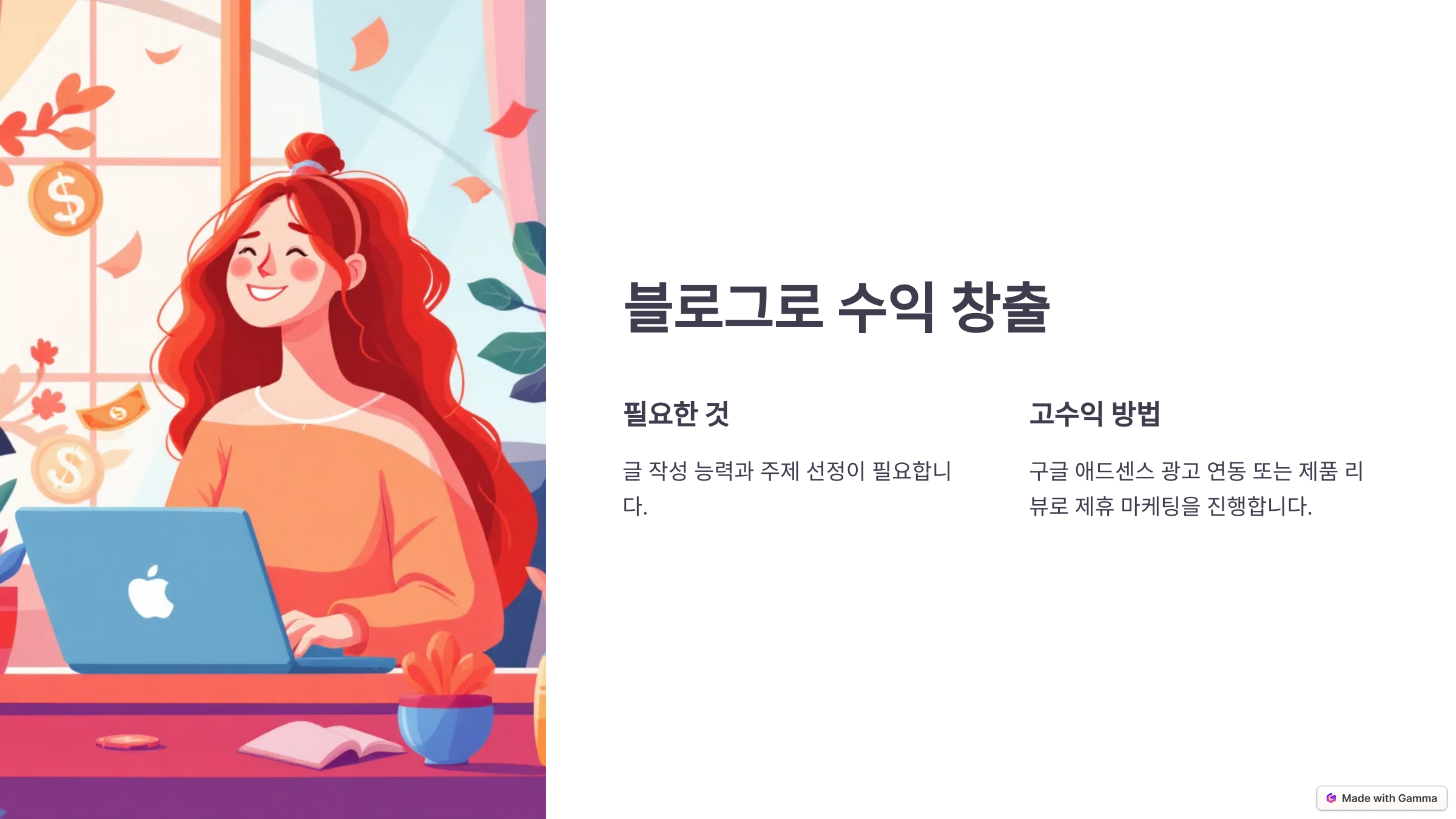 - 고수익 방법: 블로그에 구글 애드센스 광고 연동 또는 제품 리뷰로 제휴 마케팅 진행