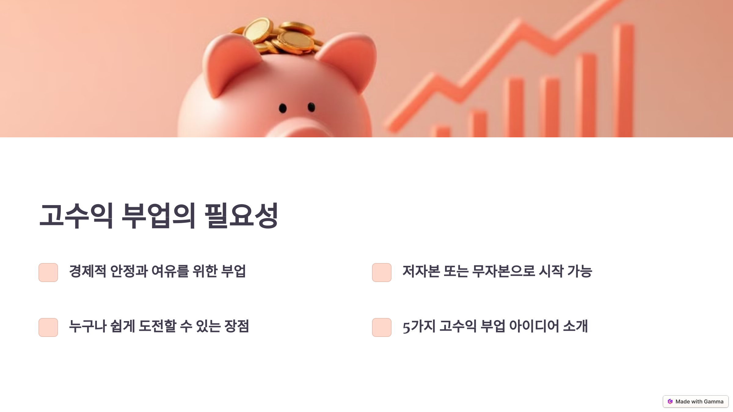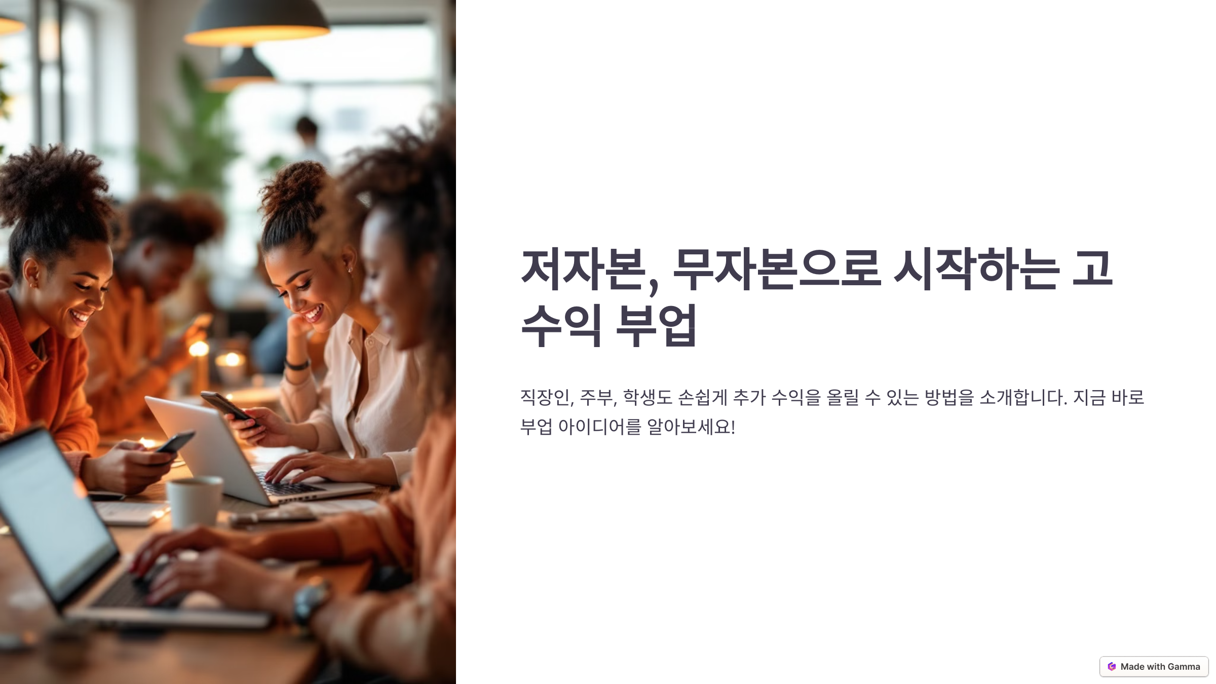 이제 저자본, 무자본으로 시작해 고수익을 올릴 수 있는 부업을 통해 경제적 여유를 만들어 보세요!