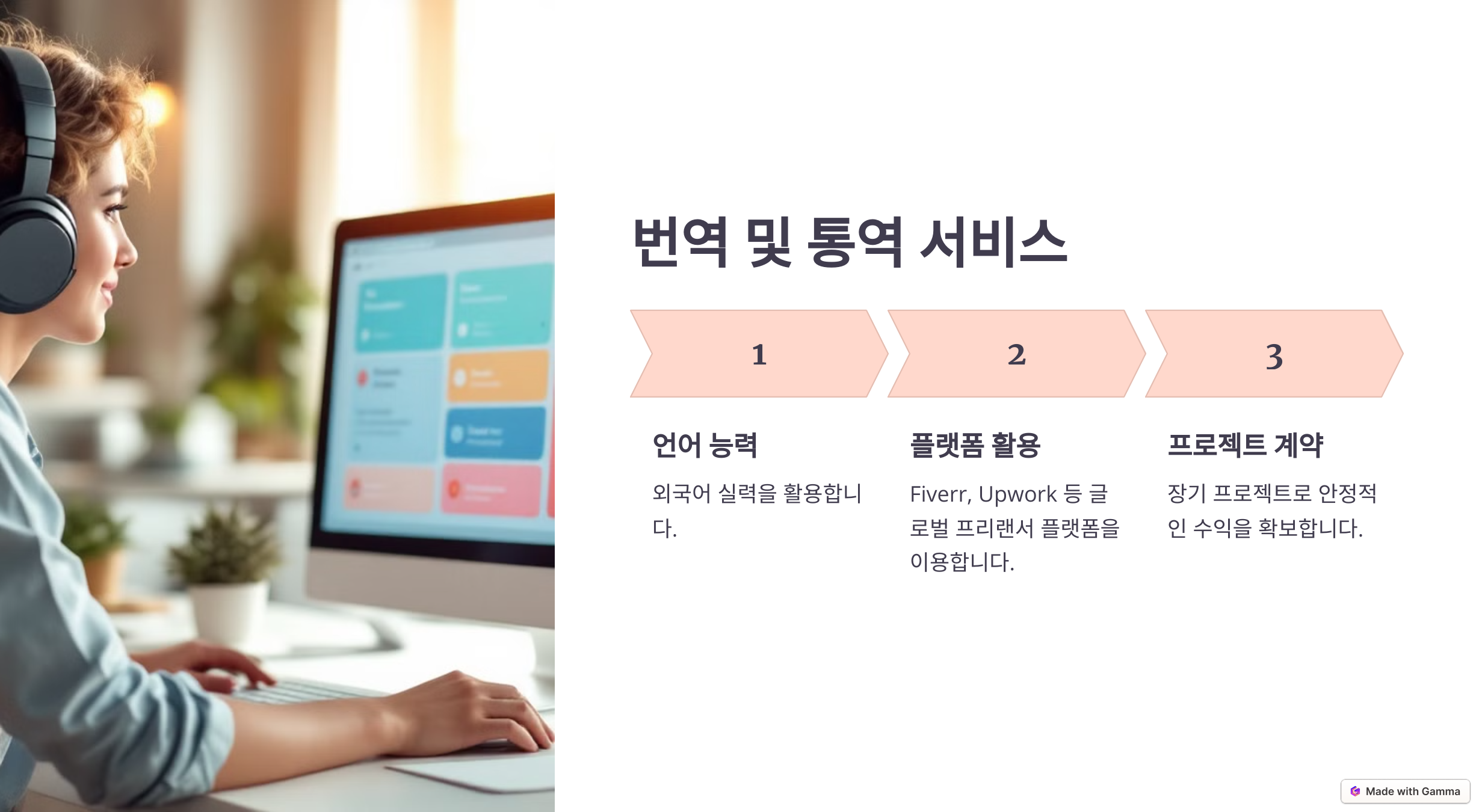 언어 능력이 있다면 번역 또는 통역 서비스를 통해 무자본으로 고수익을 창출할 수 있습니다. 전 세계 프리랜서 플랫폼(Fiverr, Upwork)을 통해 글로벌 고객을 확보할 수도 있습니다.