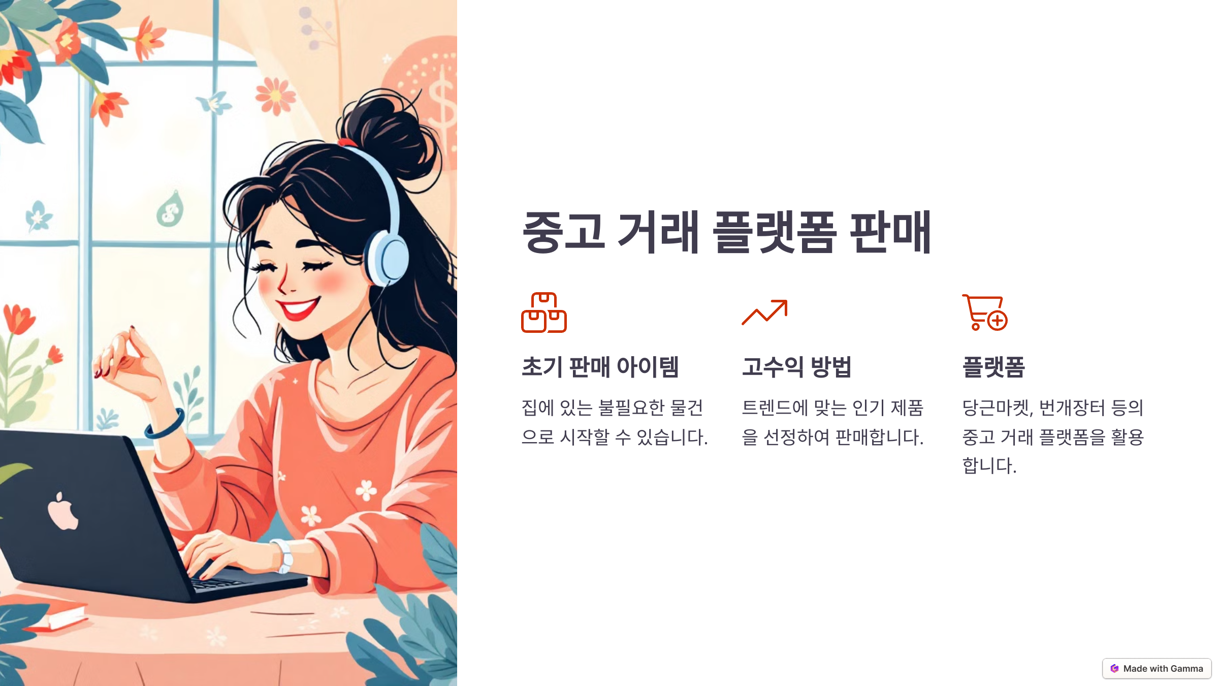 집에 있는 불필요한 물건을 중고 거래 플랫폼(당근마켓, 번개장터)에서 판매하며 시작할 수 있습니다. 이후에는 소규모 도매 구매를 통해 판매를 확대할 수 있습니다.