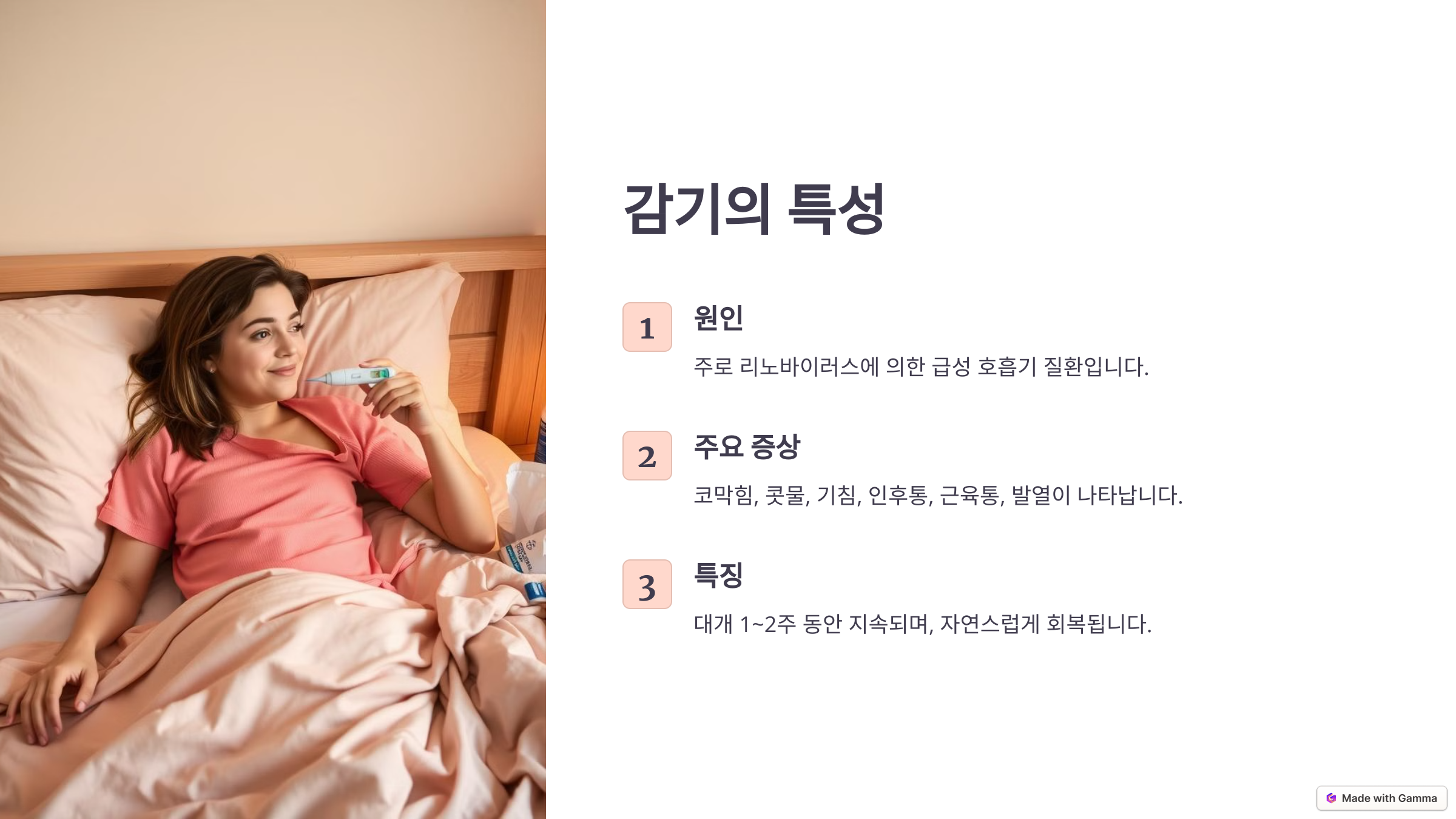 감기는 대개 1~2주 동안 지속되며, 면역 체계가 바이러스를 제거하면서 자연스럽게 회복됩니다.