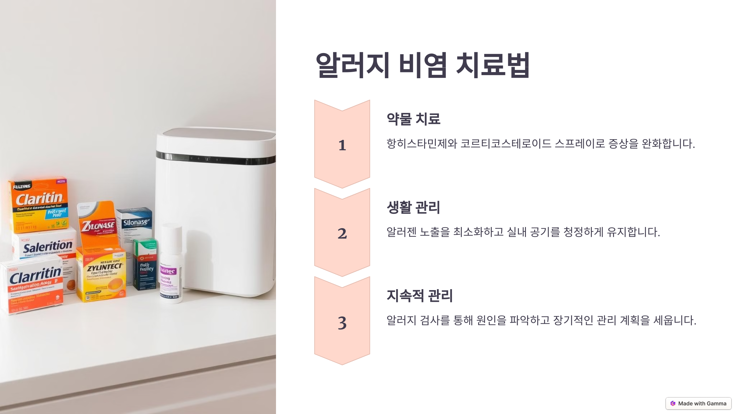 3. 생활 관리 : 실내 공기 청정기 사용, 꽃가루가 많은 날 외출 자제 등 알러젠 노출을 최소화하는 방법이 필요합니다.