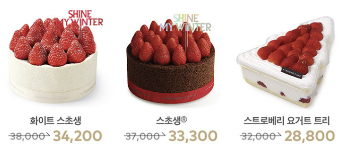- 화이트 스초생 : 생딸기 가득한 케이크로 부드럽고 폭신한 엔젤 쉬폰시트에 풍부한 쇼콜라 블랑의 화이트 초콜릿 생크림을 샌드하고 고소한 아몬드 크런치를 터치해 식감을 더한 생크림 케이크에요