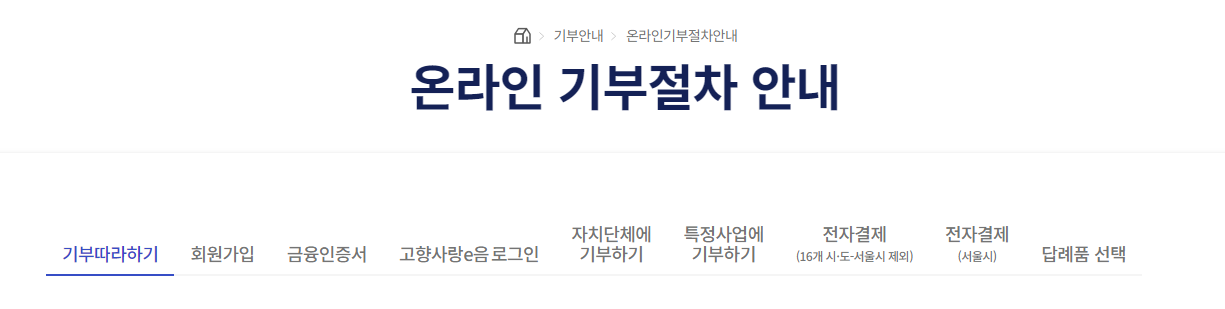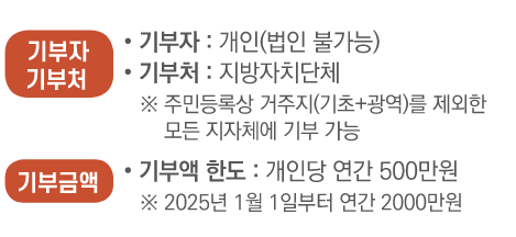 - 기부는 자치단체에 기부하기와 특정사업에 기부하기 두가지 방식이 있습니다.