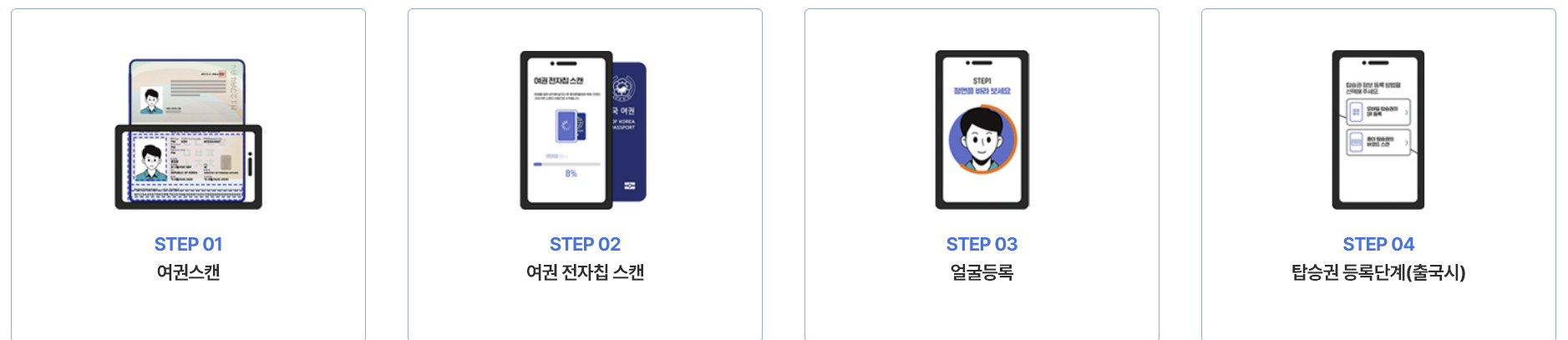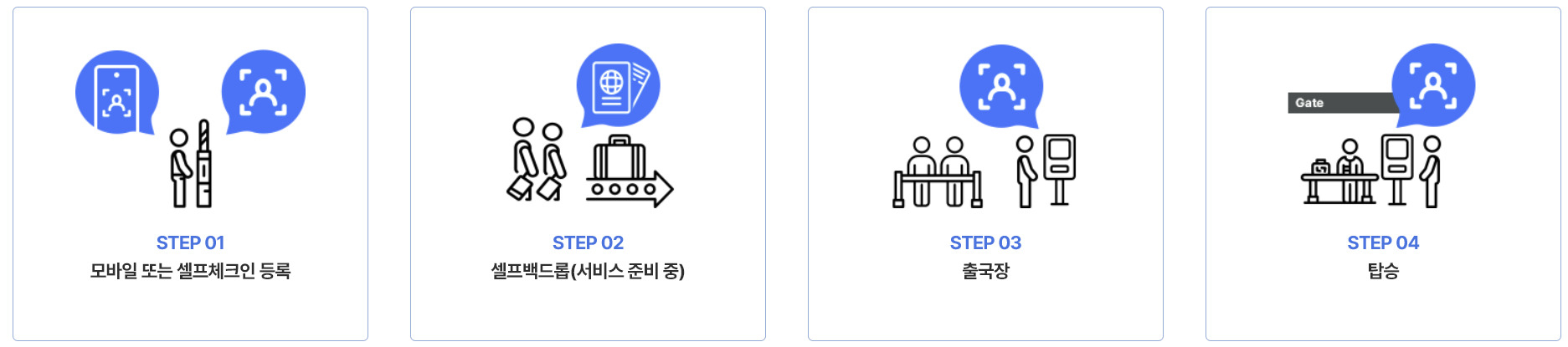 - 등록 장소: 모바일 앱 또는 공항 내 셀프체크인 키오스크 (운영준비중) 에서 생체 정보(지문 및 얼굴)를 등록합니다.