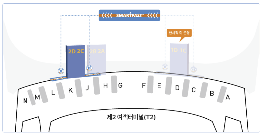 - 제 2여객터미널(T1) : 스마트패스 서비스 사용가능 출국장 위치안내