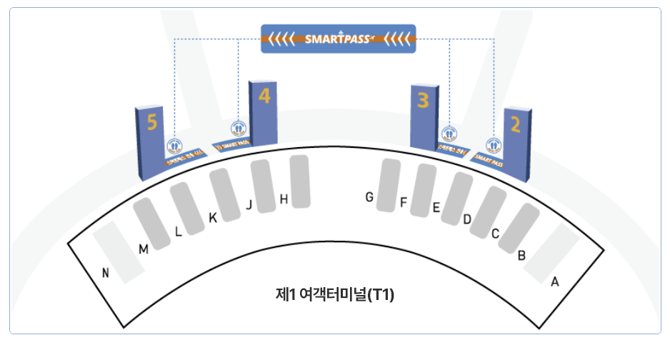 - 제 1여객터미널(T1) : 스마트패스 서비스 사용가능 출국장 위치안내