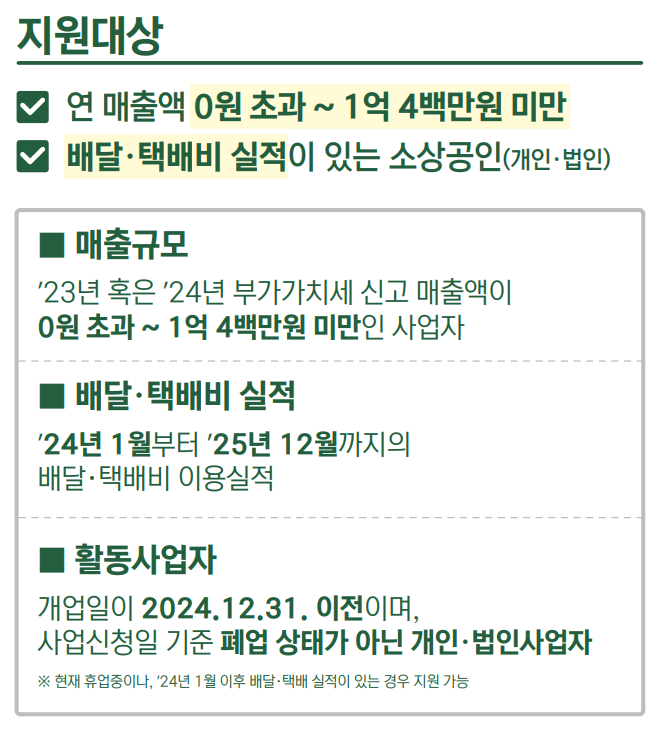 - 대상: 2023년 또는 2024년 연 매출이 1억 400만 원 미만이며, 배달 및 택배 실적이 있는 소상공인