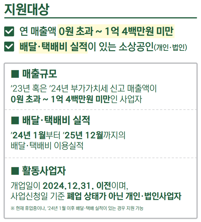 2023년 또는 2024년 연 매출액이 1억 400만 원 미만이고, 배달 또는 택배 이용 실적이 있는 소상공인이 지원 대상입니다. 신청일 기준으로 폐업 상태가 아니어야 하며, 배달 및 택배를 주업으로 하는 업종이나 소상공인 정책 자금 지원 제외 업종은 제외됩니다.