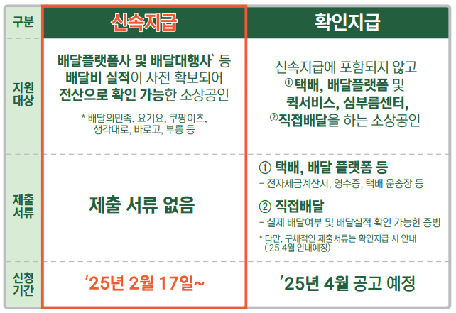 2월 17일부터 '신속 지급' 신청이 가능합니다. 배달의 민족, 요기요, 쿠팡이츠 등 주요 배달 플랫폼 이용자는 더욱 간편하게 신청할 수 있습니다.