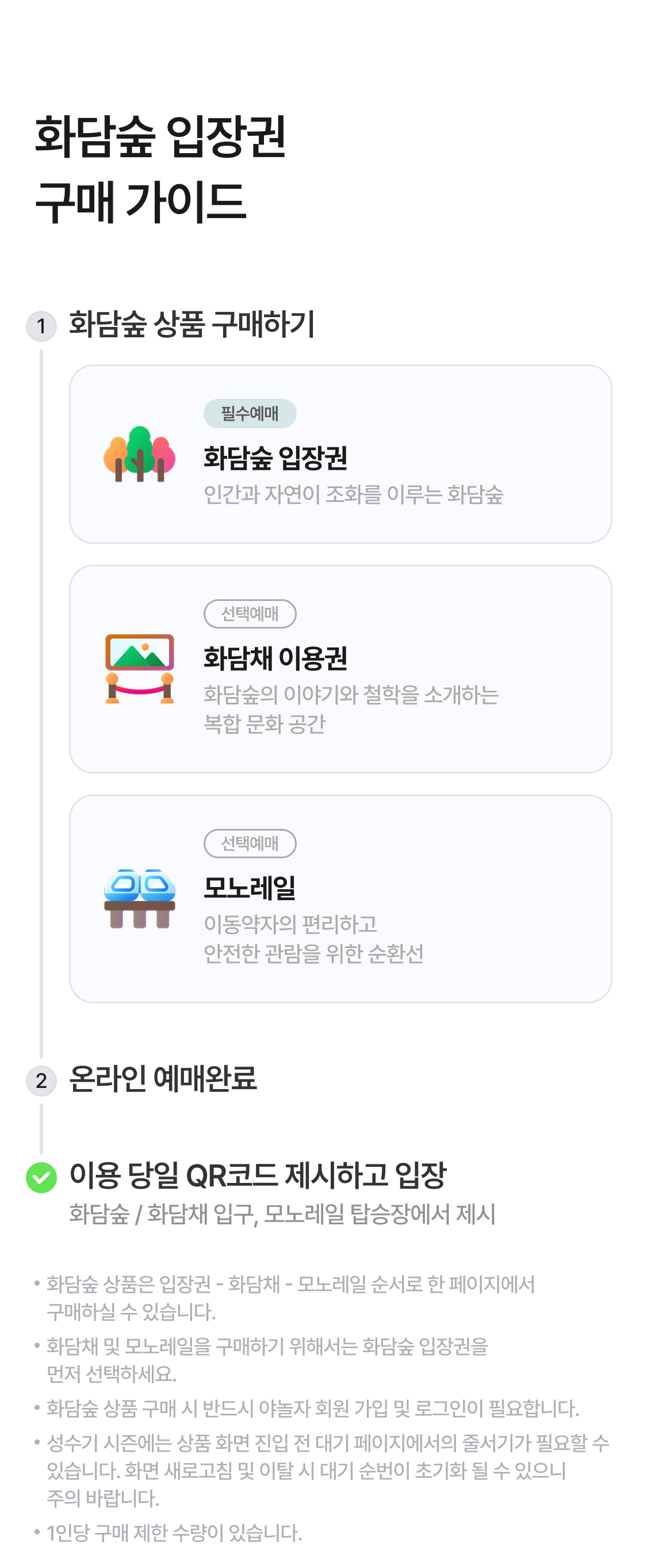 - 화담채 입장권과 모노레일 탑승권은 선택 구매로 입장 및 탑승 계획이 없으시거나 이미 포함된 프로그램 상품이라면 선택하지 않으셔도 됩니다.