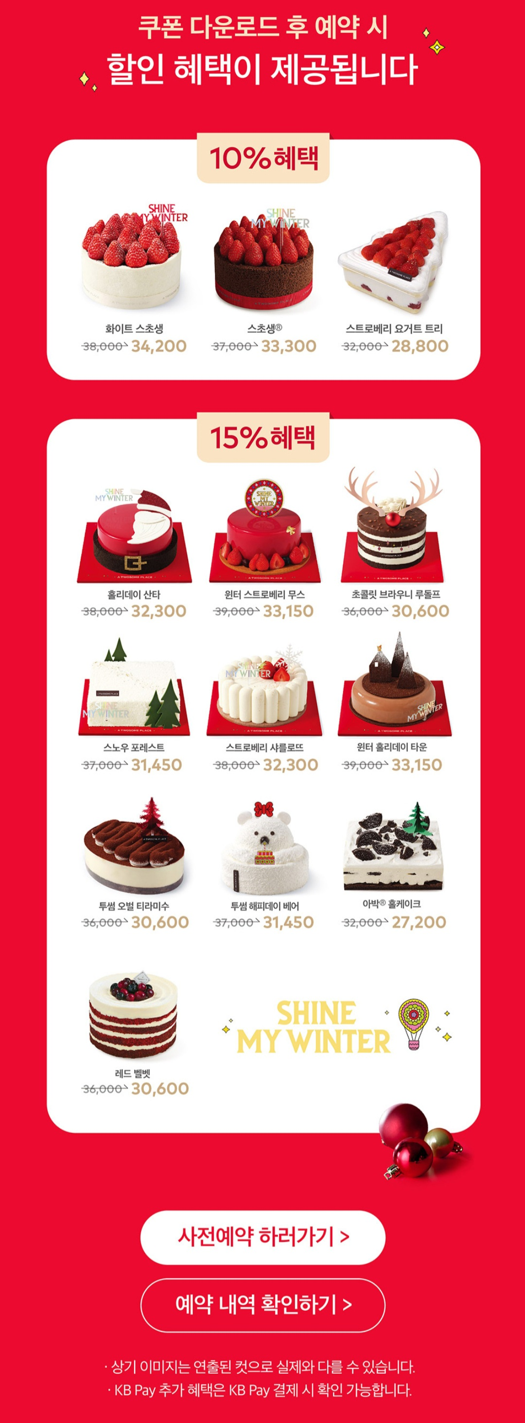 투썸플레이스 크리스마스 케이크 예약이 시작됐습니다! 인기 제품과 혜택 정보를 빠르게 확인하고 원하는 케이크를 11.15부터 12.15일까지사전예약을 하면 최대24% 할인혜택을 누릴 수 있습니다. 지금 바로 예약하세요.