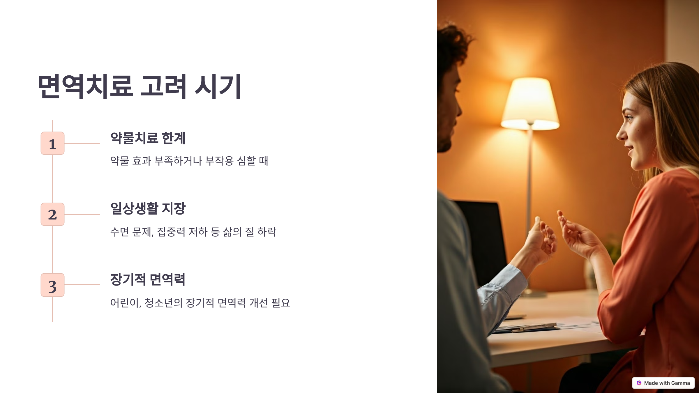 알러지 비염은 항히스타민제나 코르티코스테로이드 스프레이로 증상 완화가 가능하지만, 약물치료가 효과적이지 않거나 장기 복용이 필요한 경우라면 면역치료를 고려할 수 있어요. 특히 약물치료에 효과가 적고 부작용이 심하다면 면역치료가 더 나은 해결책이 될 수 있습니다.