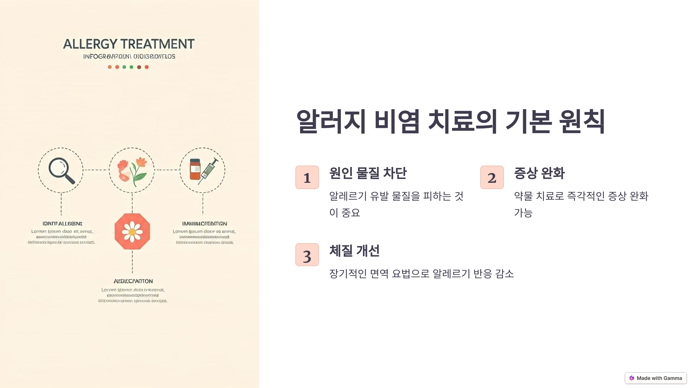 알러지 비염을 효과적으로 관리하기 위해서는 개인에 맞는 약물 치료와 면역 요법을 병행하는 것이 좋습니다. 증상이 심할 때는 약물을 통해 빠르게 증상을 완화하고, 장기적으로는 면역 요법을 통해 체질 개선을 도모하는 방식이 효과적입니다. 또한, 생활 환경을 철저히 관리하고 면역력을 강화하는 식단을 유지하면 알러지 비염의 발생을 줄이고 일상생활의 질을 높일 수 있습니다.