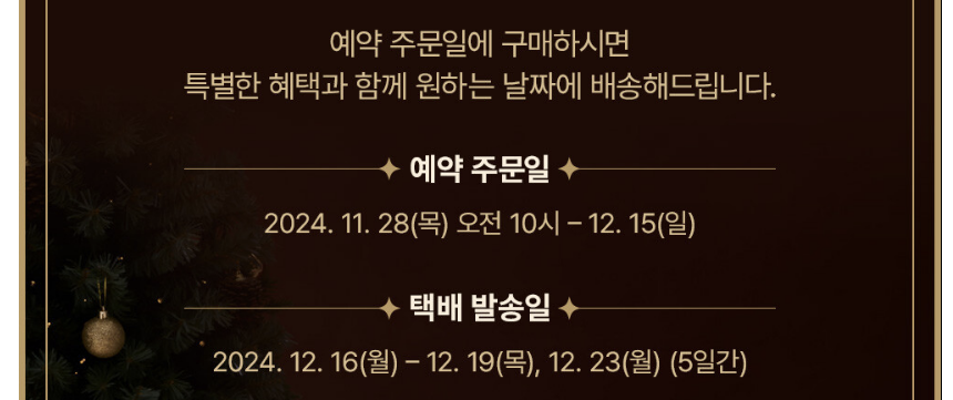 - 배송 일정: 예약 시 2024년 12월 16일(월)부터 12월 19일(목), 12월23(월) (5일간) 선택한 날짜와 시간에 매장에서 수령할 수 있습니다.