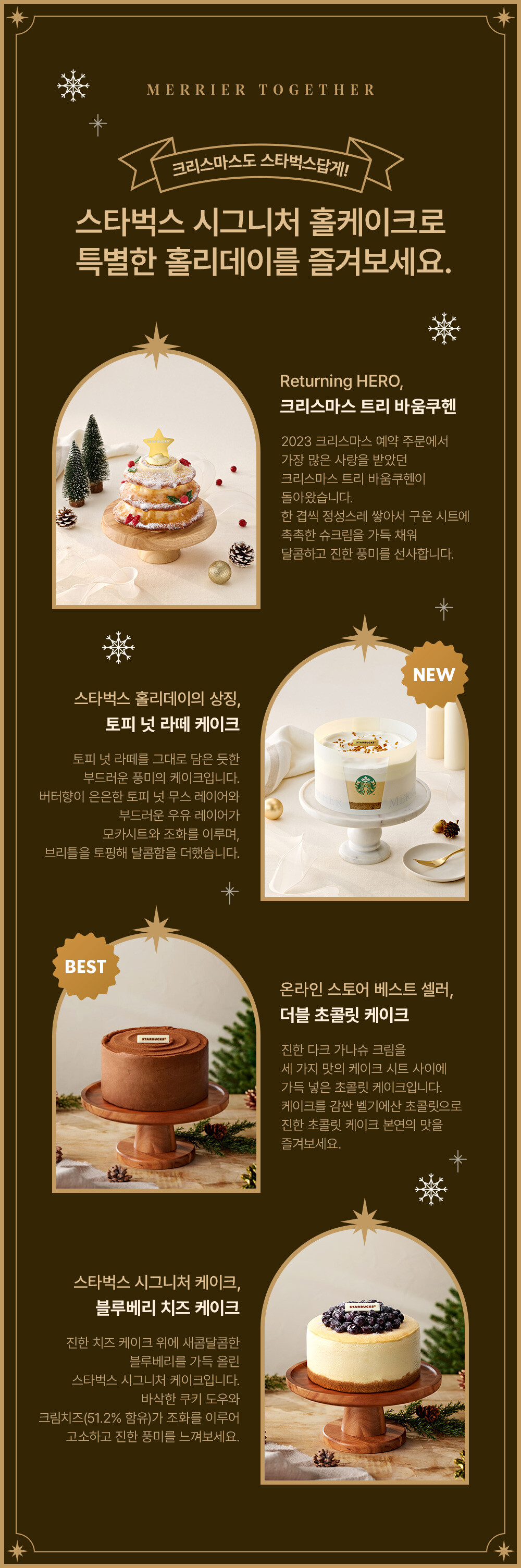 - 크리스마스 트리 바움쿠헨 : 2023 크리스마스 예약 주문에서 가장 많은 사랑을 받았던 크리스마스 트리 바움쿠헨이 돌아왔습니다. 한 겹씩 정성르세 쌓아서 구운 시트에 촉촉한 슈크림을 가득 채워 달콤하고 진한 풍미를 선사합니다.