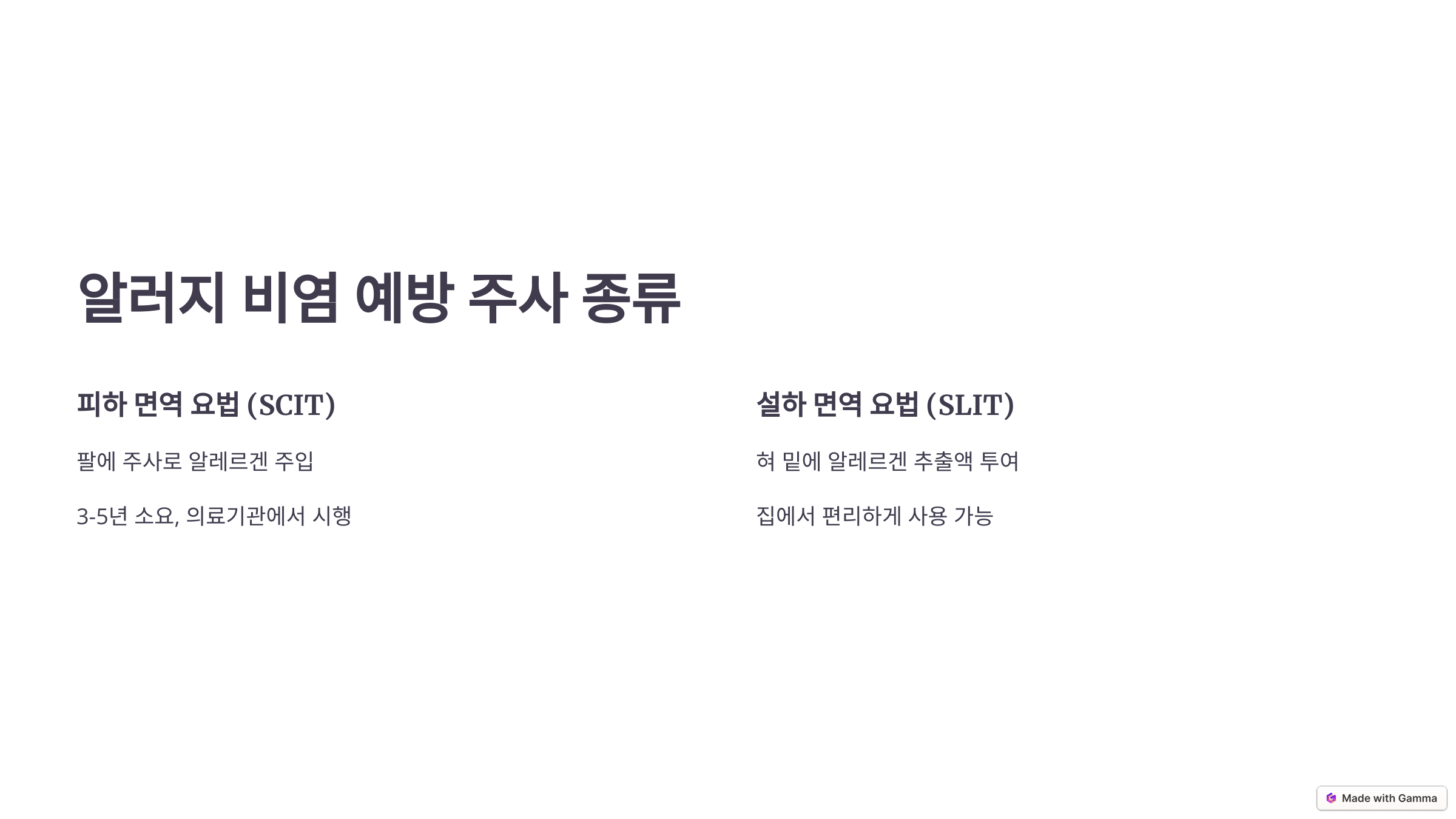 - 팔에 주사를 통해 알레르겐을 주입하는 방식입니다.