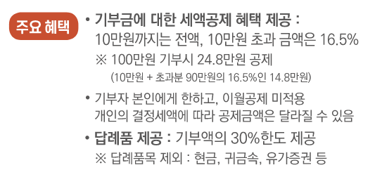 세액 공제 혜택 : 연간 최대 500만 원까지 기부 가능하며, 10만 원 이하 기부금은 전액 세액 공제됩니다.