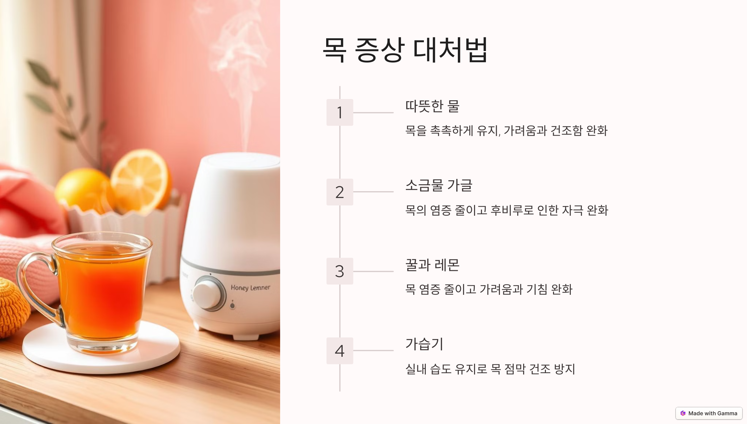 - 💬 목 관리 : 꿀물 마시기, 소금물 가글, 자극적인 음식 피하기